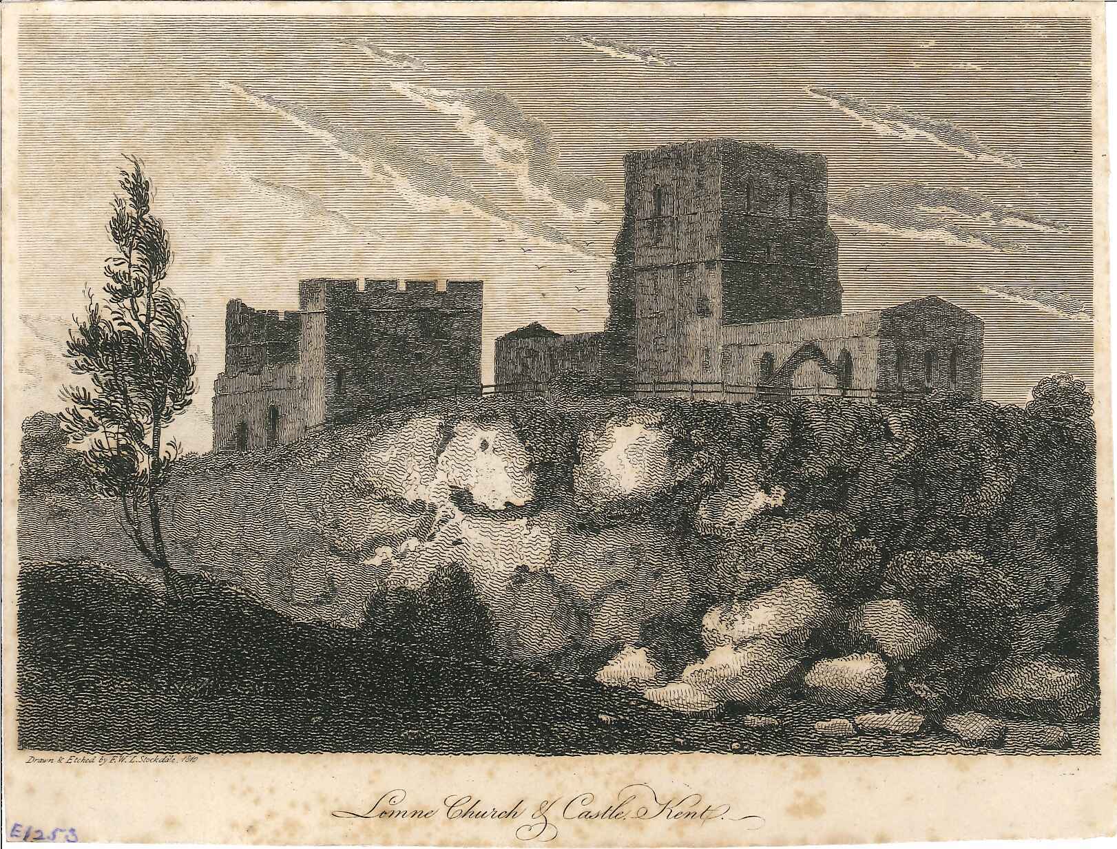 - DescriptionEngraved print of Lympne castle & church tower; seen from the slopes, with broken ground in the foreground.