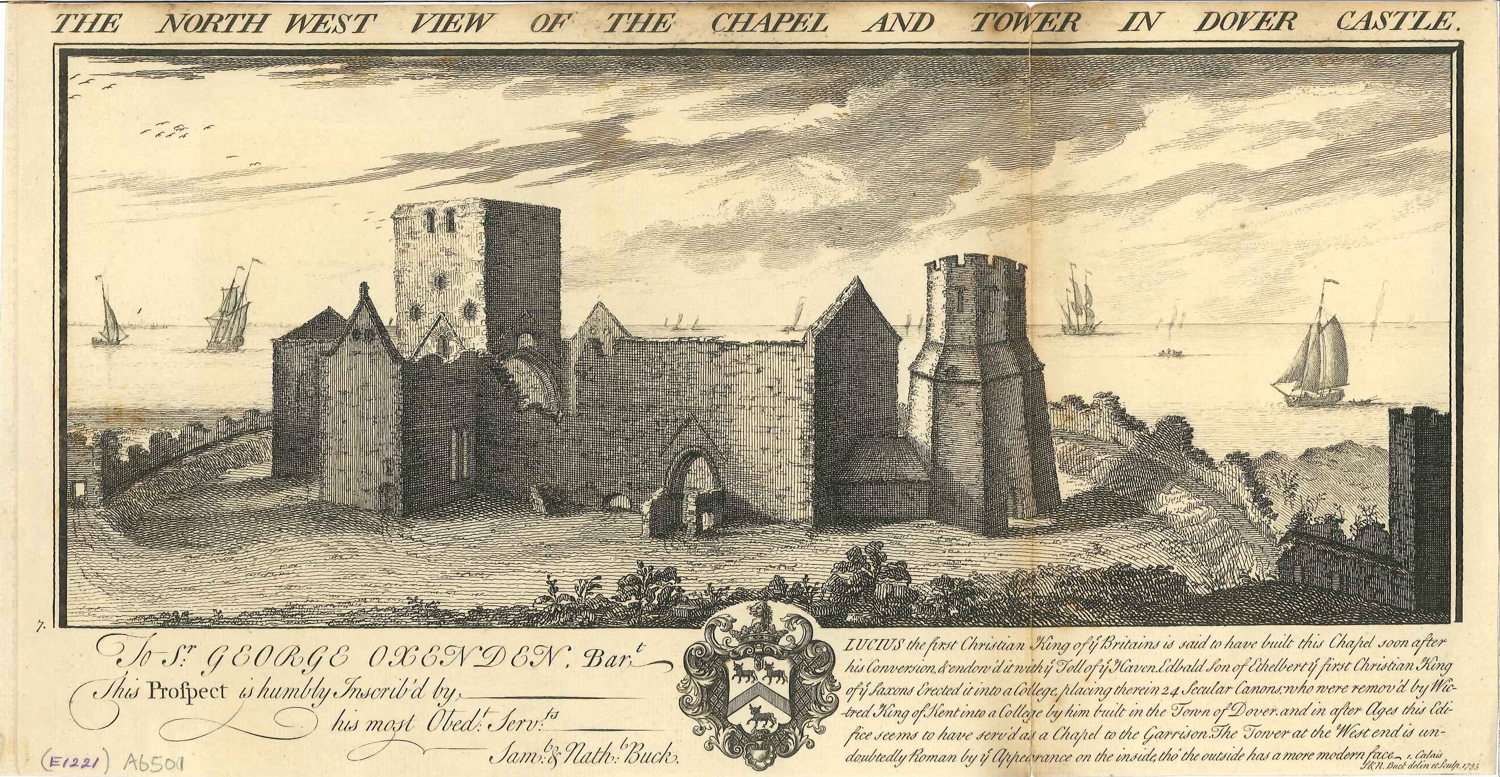 - DescriptionEngraving of a north-west view of Dover castle chapel (St Mary-in-Castro church) & tower (Pharos) in 1735; seen from the land, various vessels on the sea behind; produced for Buck's 'Views of Ruins of Castles & Abbeys in England' (1726-1739). An old fold has caused weakness & some splitting.