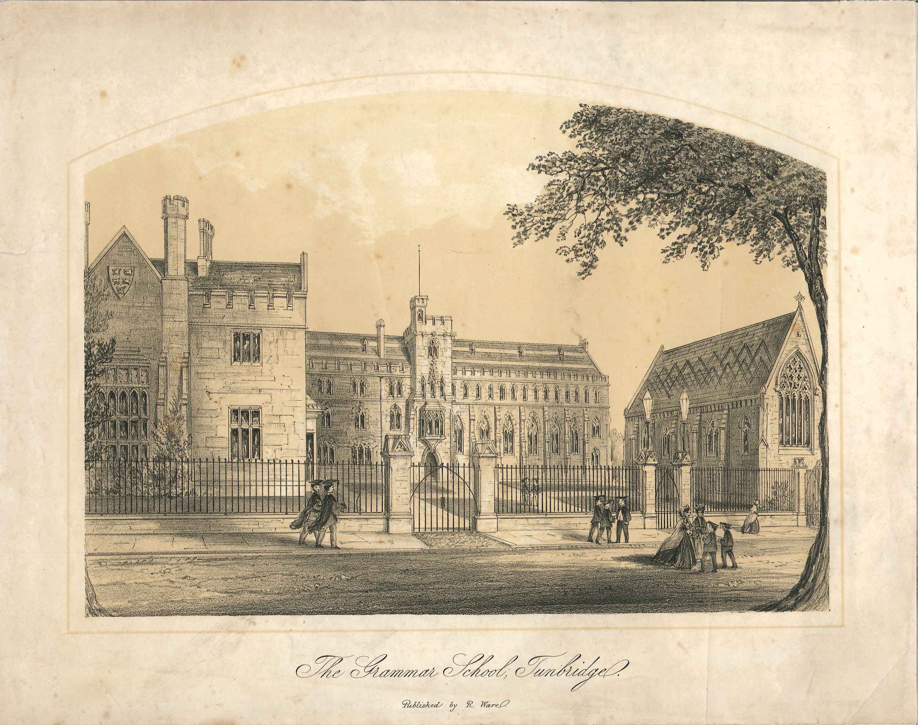 - DescriptionLithographic print of a pencil drawing of Tonbridge Grammar School; lightly toned with a brown colour; shows a scene from the road with pupils & other pedestrians walking past the school.