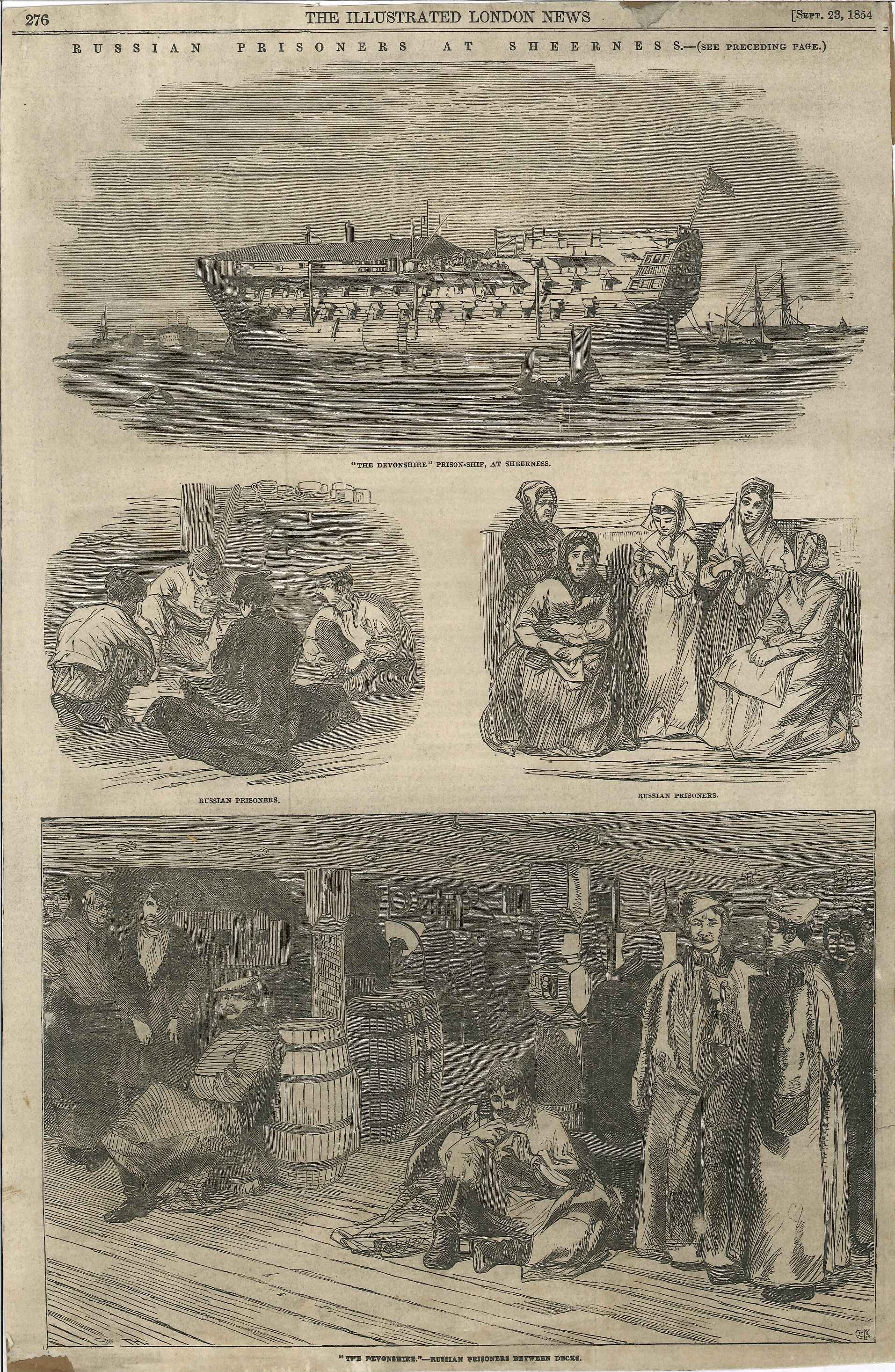 - DescriptionPage from the 'London Illustrated News' shows pictures of Russian prisoners from the Crimean War on the 'Devonshire' prison hulk at Sheerness; 4 images: 1. hulk ship; 2.seated Russian men gambling; 3. Russian women; 4. Russian men between decks.