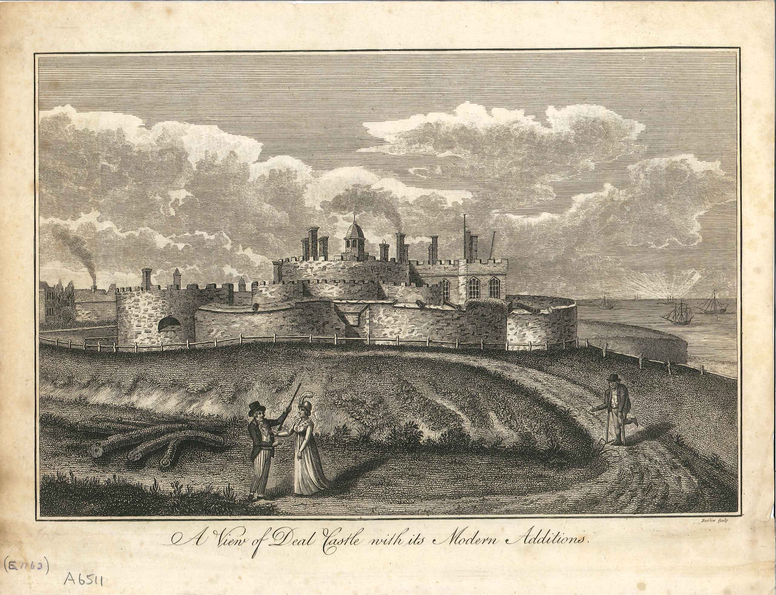 - DescriptionPrint of a view of Deal castle; pedestrians in the foreground on the outer works; ships on the right background.