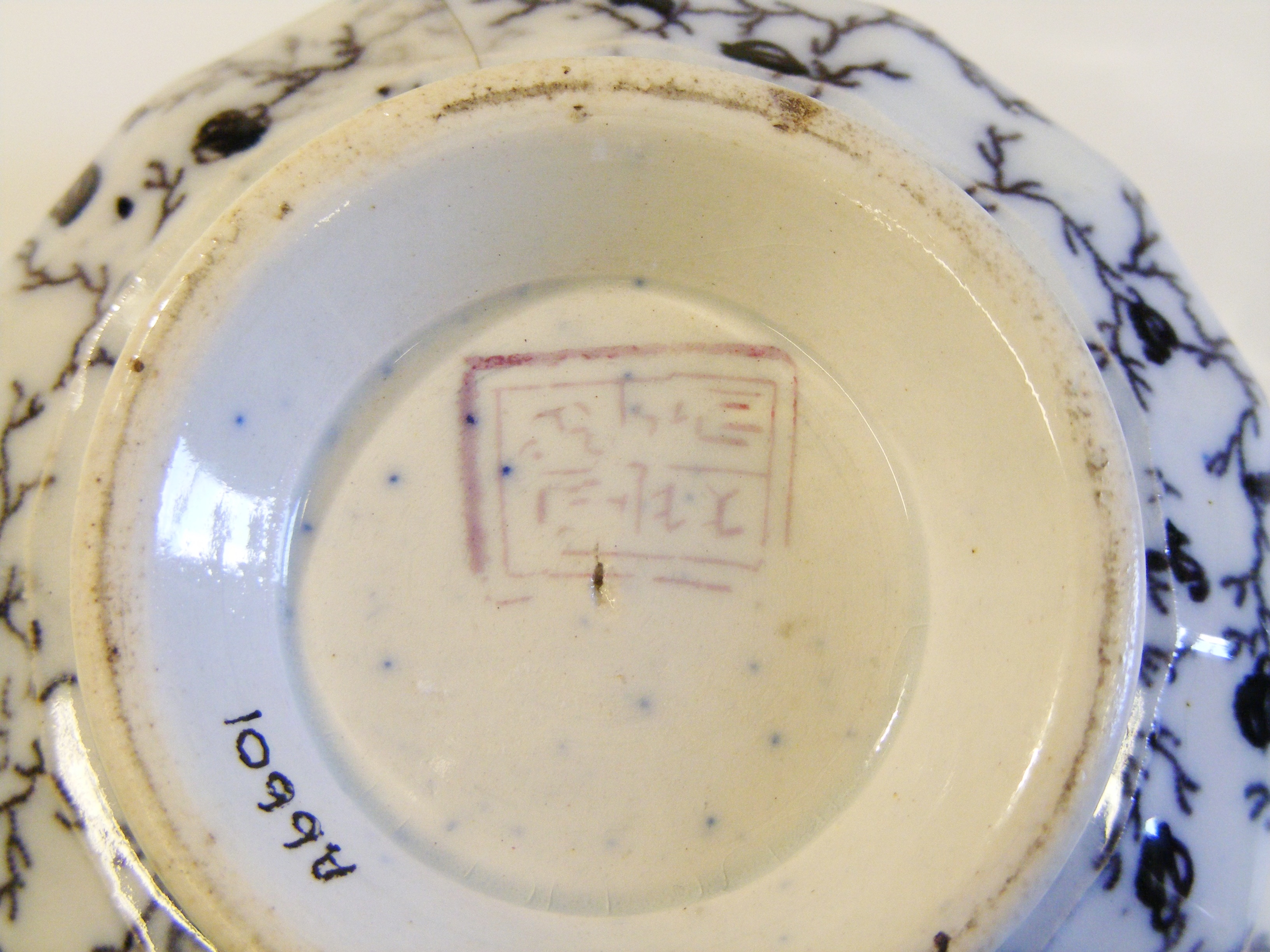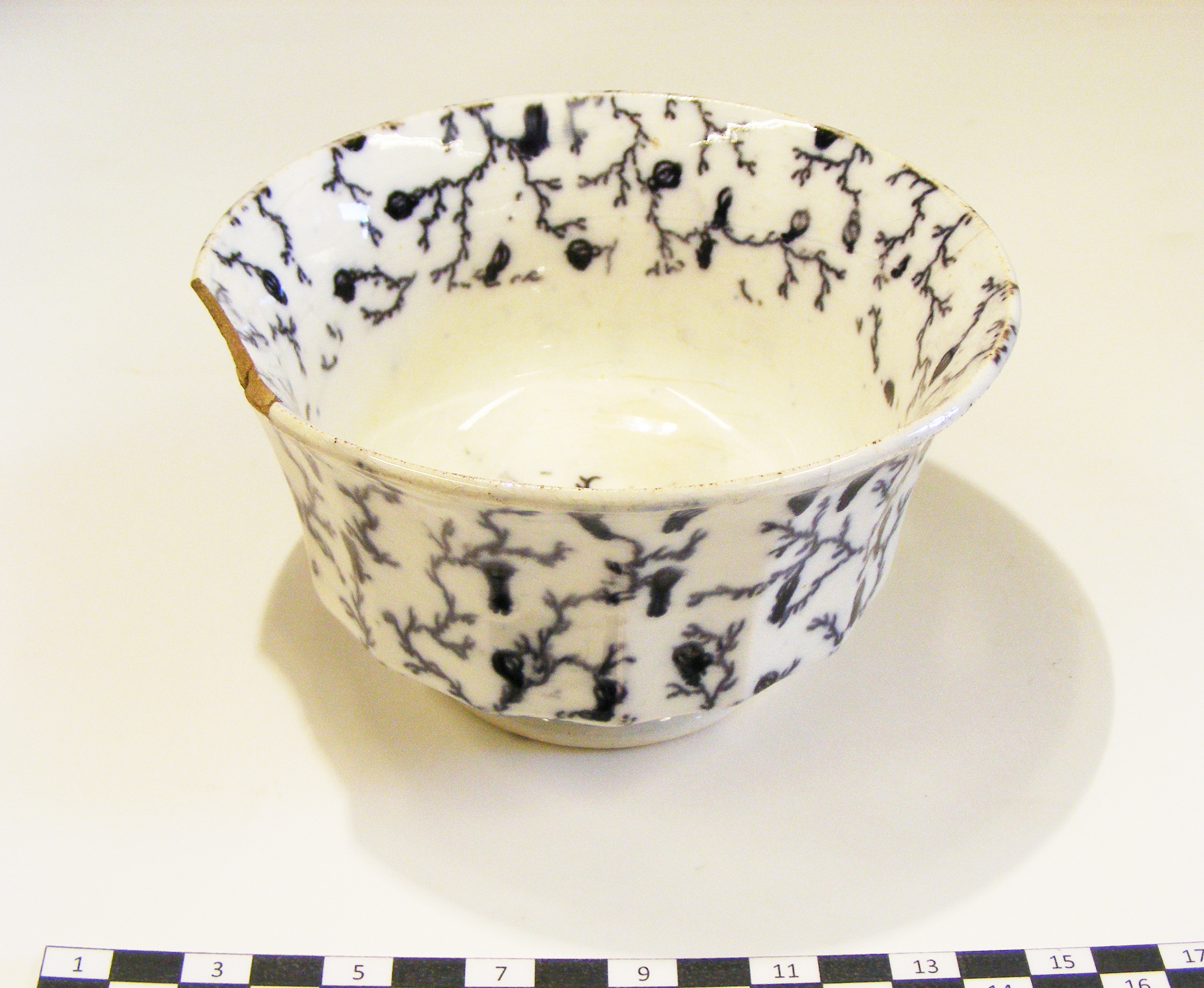 - Descriptionbowl; tea slop bowl; white moulded fluted porcelain body, with slightly flared rim; seal mark on base; overall hand-painted design in black of trailing branches with numerous seed heads; crack in side, small section in rim missing. Probably Japanese, made for the European market; purple seal mark on the base.