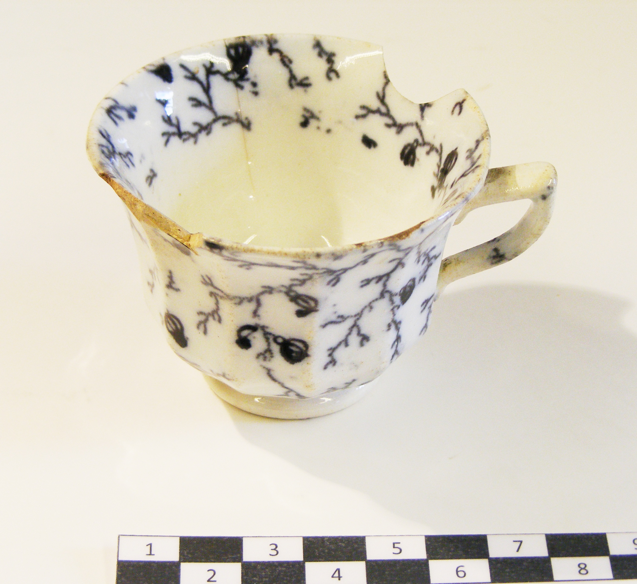 - Descriptionteacup; white moulded fluted porcelain body, with slightly flared rim, chipped; seal mark on base; overall hand-painted design in black of trailing branches with numerous seed heads; a saucer for this cup is one of A6603/1-3. Probably Japanese, made for the European market.