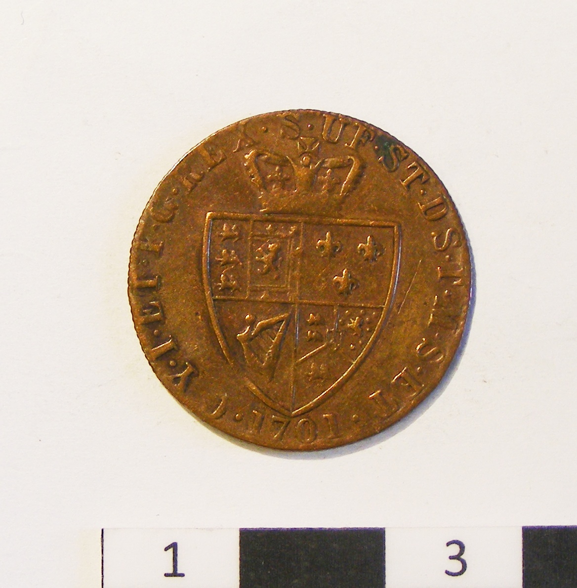 Token; imitation spade guinea; copper alloy, used for advertising die sinkers & toolmakers; obv: right laureate bust of George III; rev: crowned 'spade' shield with royal arms & amended motto. The deceptive 1701 date is a modified 1791. The modified reverse legend incorporates the manufacturer's name: 'G(eorge) Y(orke) I(Iliffe) ET F(rederick) G(ardner) REX S UF(olk) ST D(ie) S(inkers) T(ool) M(akers) ET(c).