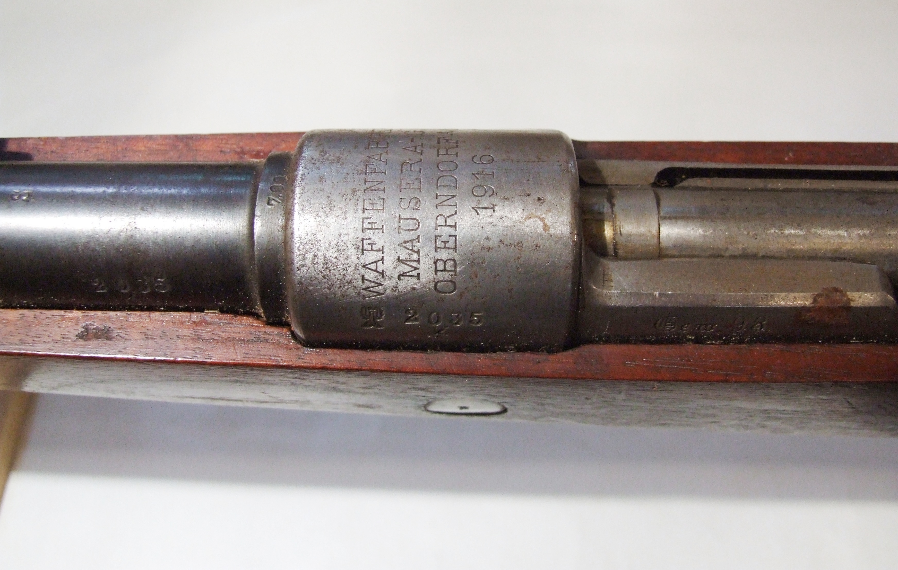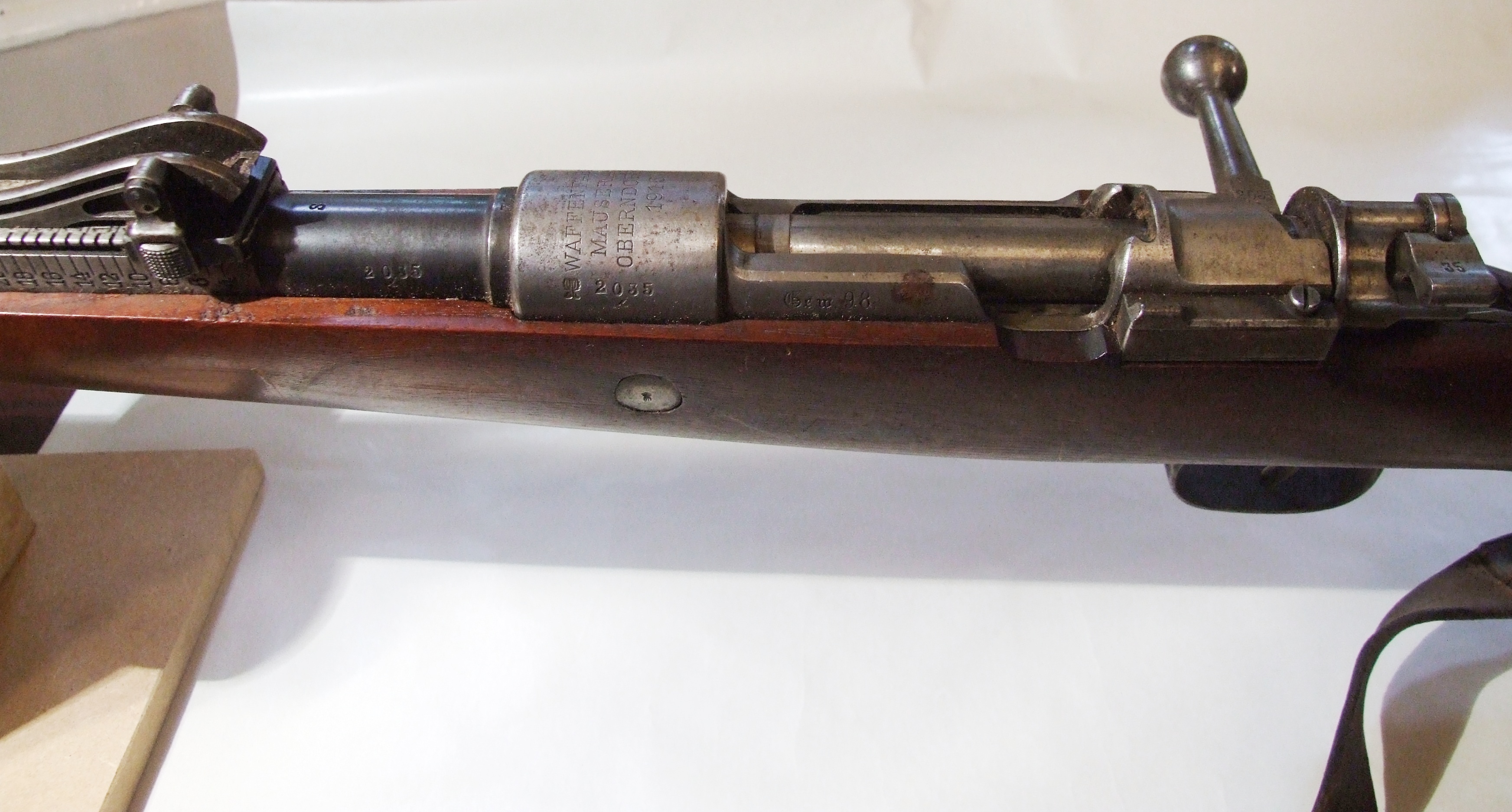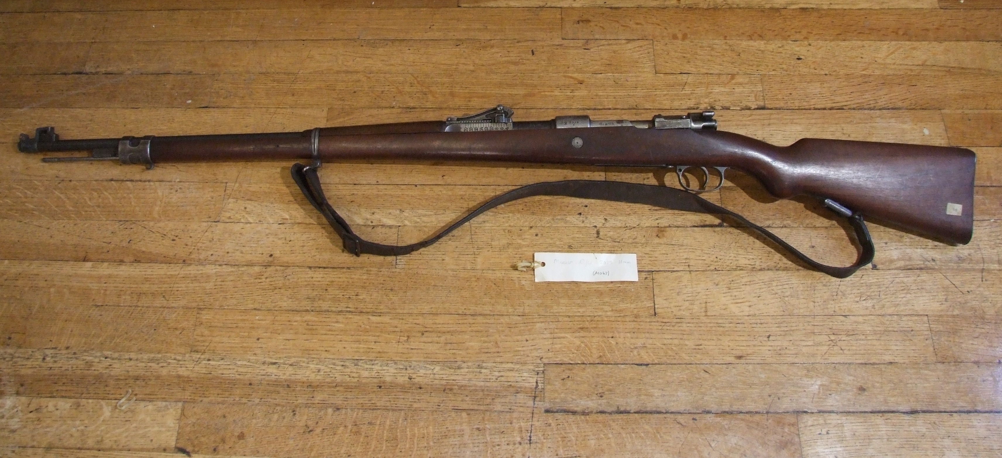 - DescriptionMauser 1914 pattern rifle, 11mm; good condition, fully working mechanism (bolt not matching); light pitting on metalwork; folding sights; muzzle has folding cover; leather shoulder strap.