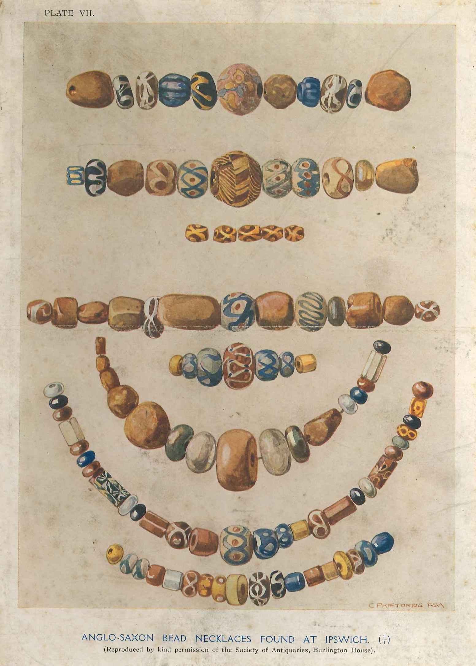 - DescriptionColoured print of a watercolour of Anglo-Saxon bead necklaces from Ipswich; presumably from an archaeological report. These have been mounted on card & previously framed, presumably for display at Eastgate House Museum. Some light foxing & discolouration.
