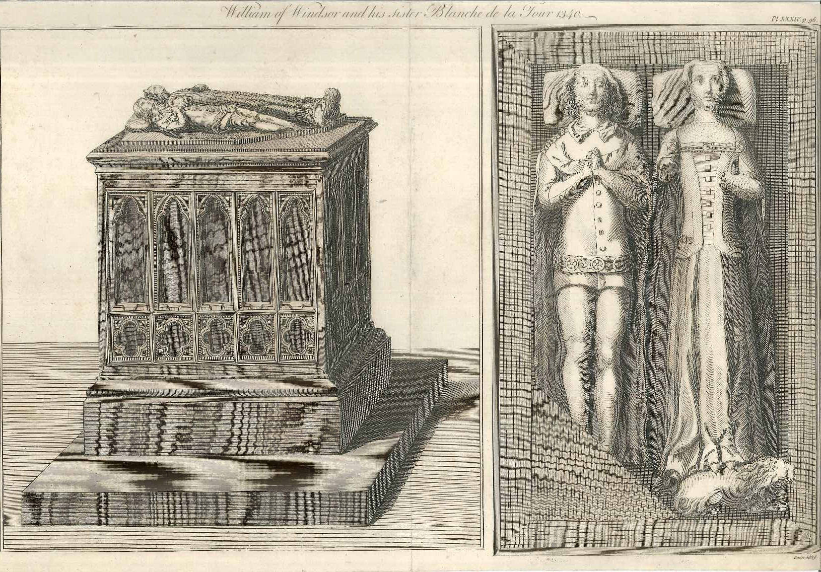 - Descriptionephemera; large engraving showing ecclesiastical architectural details; tomb of William of Windsor & Blanche de la Tour in Westminster Abbey, 1340; to scale; from a large volume (plate/ page no., etc); oblique & plan views.