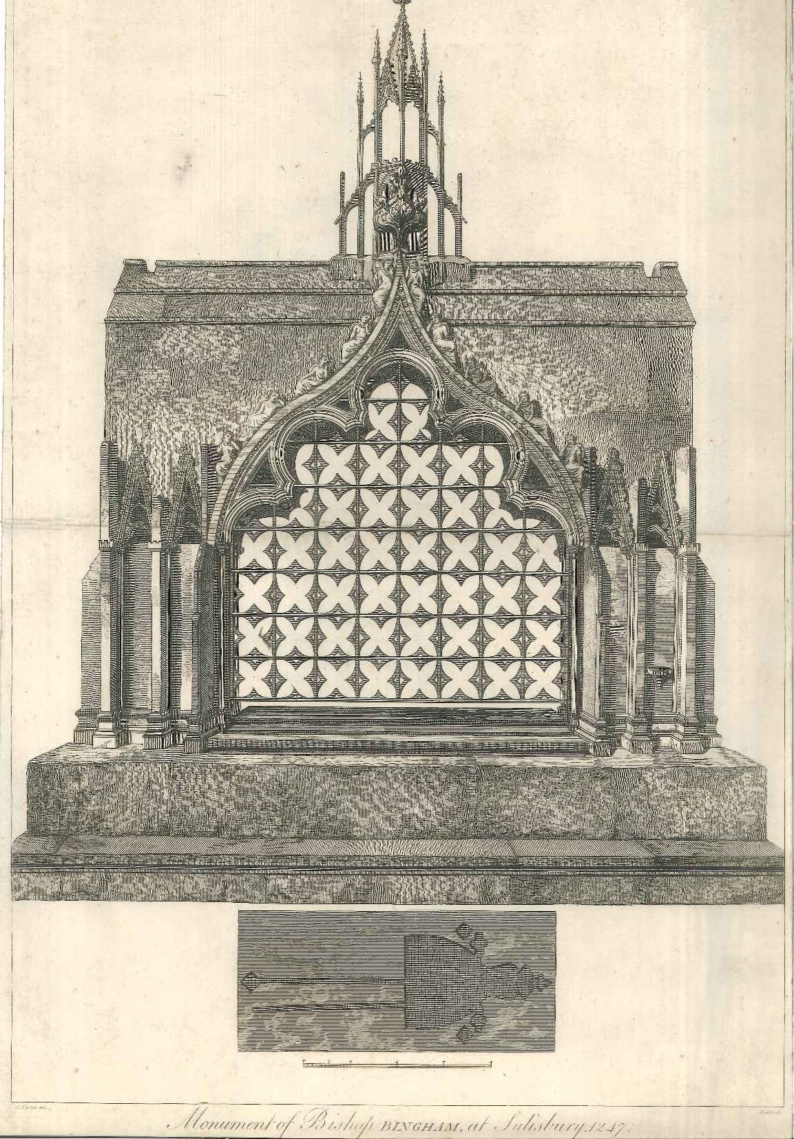 - Descriptionephemera; large engraving showing ecclesiastical architectural details; tomb of Bishop Bingham in Salisbury cathedral, 1247; to scale; from a large volume (plate/ page no., etc).