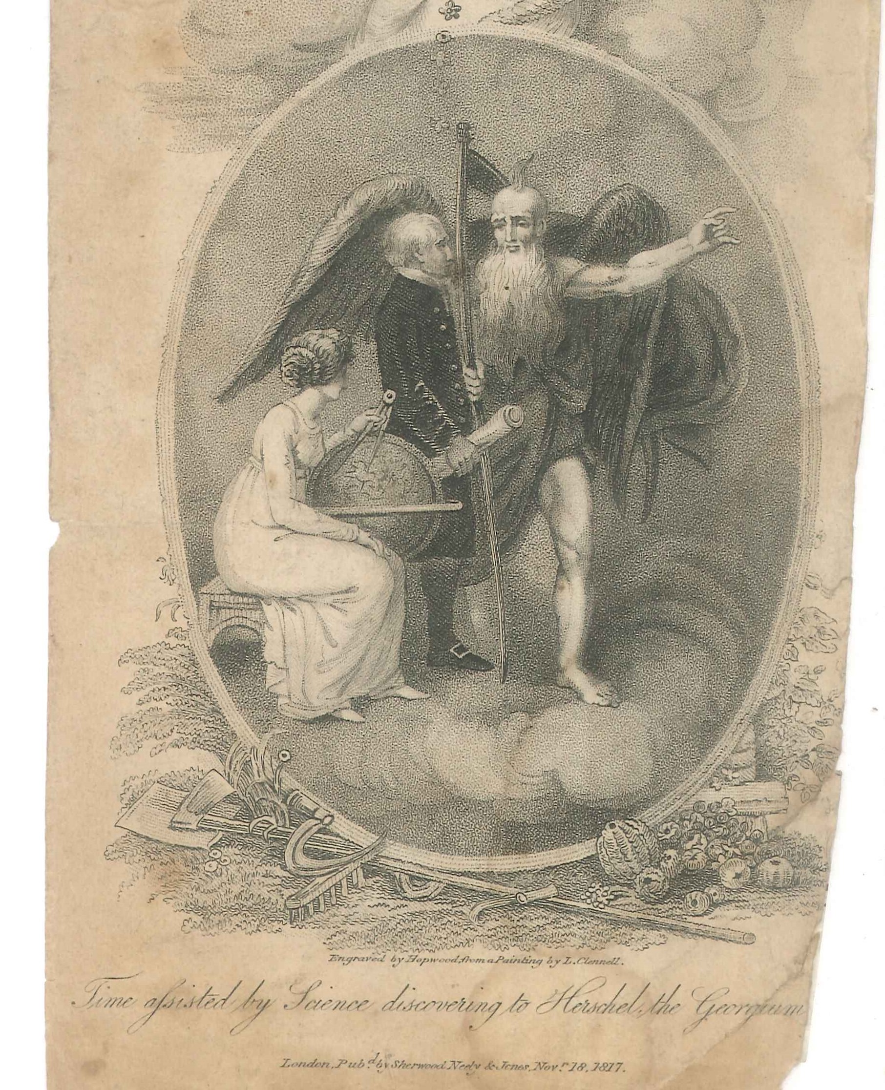 - DescriptionSmall lithographic print of the astronomer Sir William Herschel, assisted by Time & Science, discovering the planet 'Georgium Sidus' (later called Uranus).