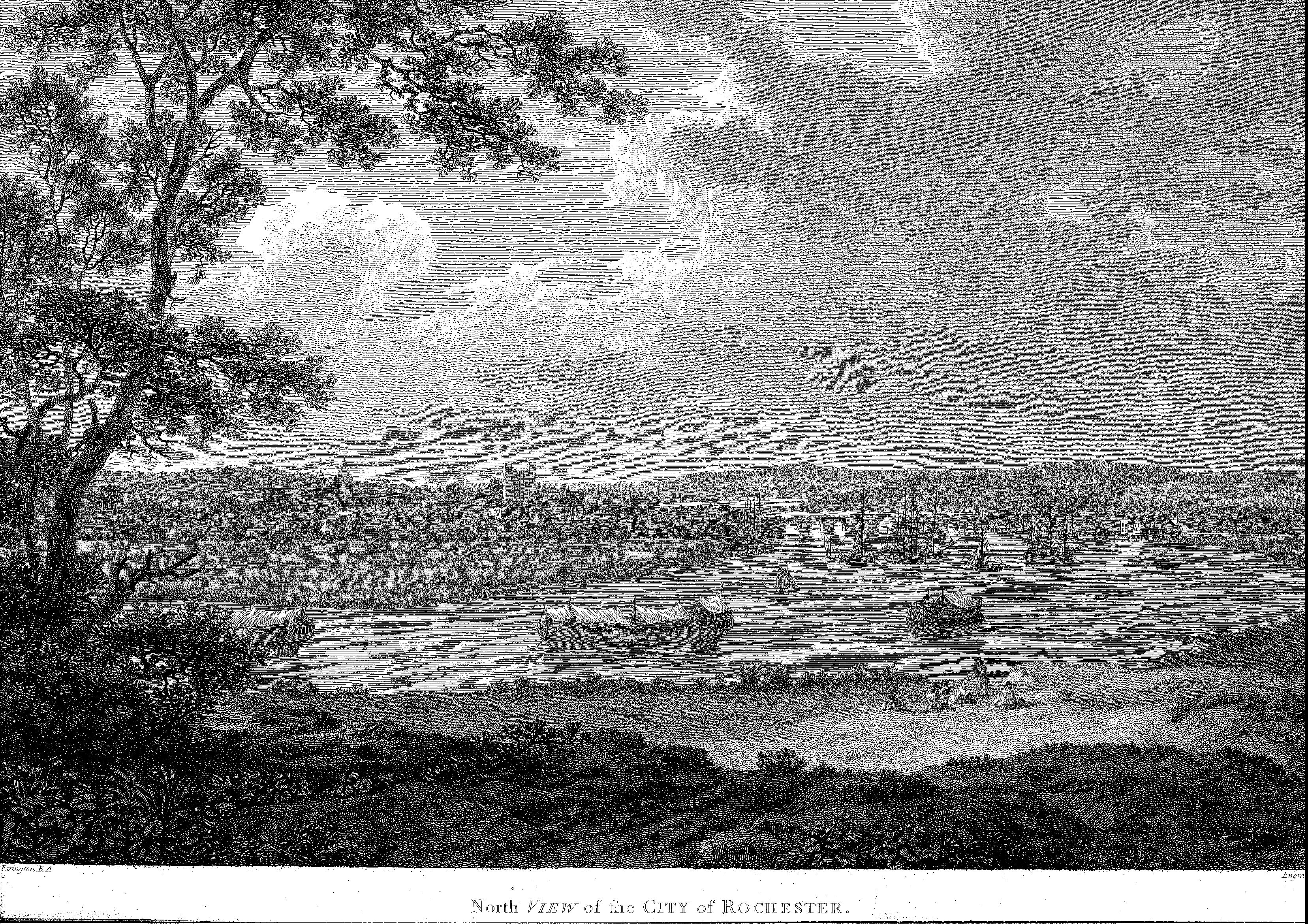 - DescriptionEphemera; print of 'North View of the City of Rochester'; depicts scene of River, castle, cathedral & various sailing vessels, including mastless warships laid up 'in ordinary'. Backed on to card, previously framed, presumably formerly on display. Old typed label on the reverse refers to this as no.11, presumably of a set of prints.