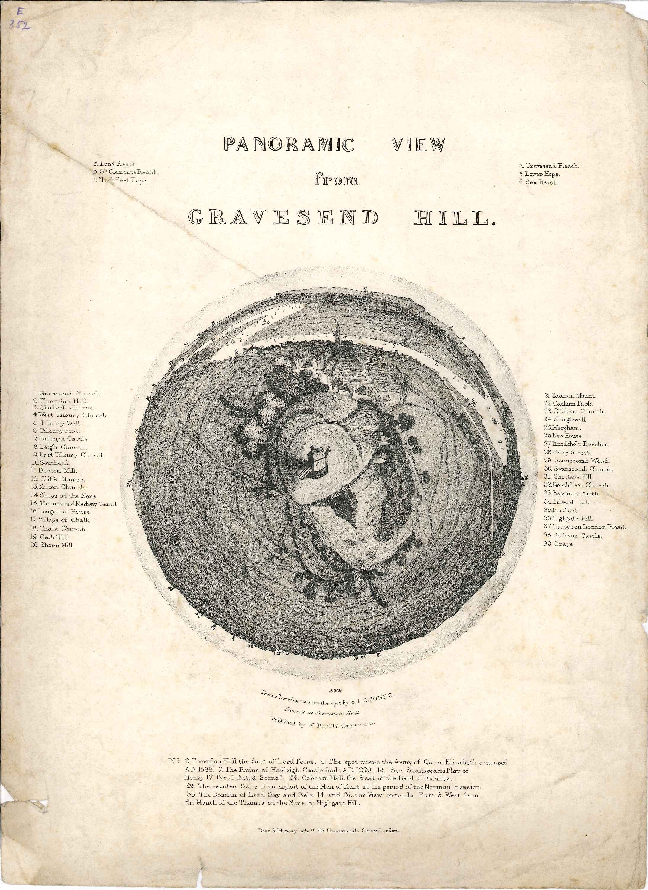 - DescriptionEphemera; lithographic print of a panoramic view from the top of Gravesend Hill; at the centre is the windmill, with 39 numbered landmarks labelled in a circular panoramic view.