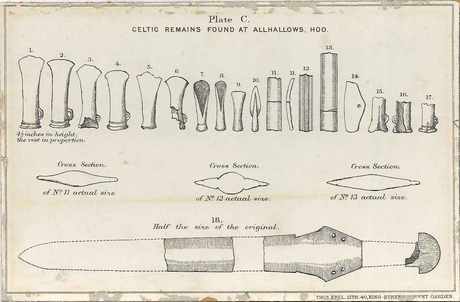 - DescriptionLithographic print of details of Bronze age items found at Allhallows, Hoo; 18 items shown, mostly LBA socketed axeheads, with spearhead & fragmentary sword; from a journal (Arch Cant?). Mounted on card, display material from the early history of the museum, circa 1905. Items were formerly in the collection of Humphrey Wickham, now in the British Museum.