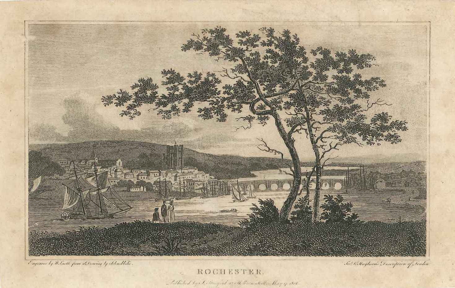 Engraved print of Rochester; based on a picture by Schnebbelie, engraved by Wolnoth; shows Rochester from the Frindsbury shore; some ships on the river, pedestrians in the foreground; taken from Dr Hughson's 'Description of London'; light staining. From Dr David Hughson's multi-volume illustrated work 'Description of London', published circa 1810; it actually covered an area about 30 miles around London & the home counties.