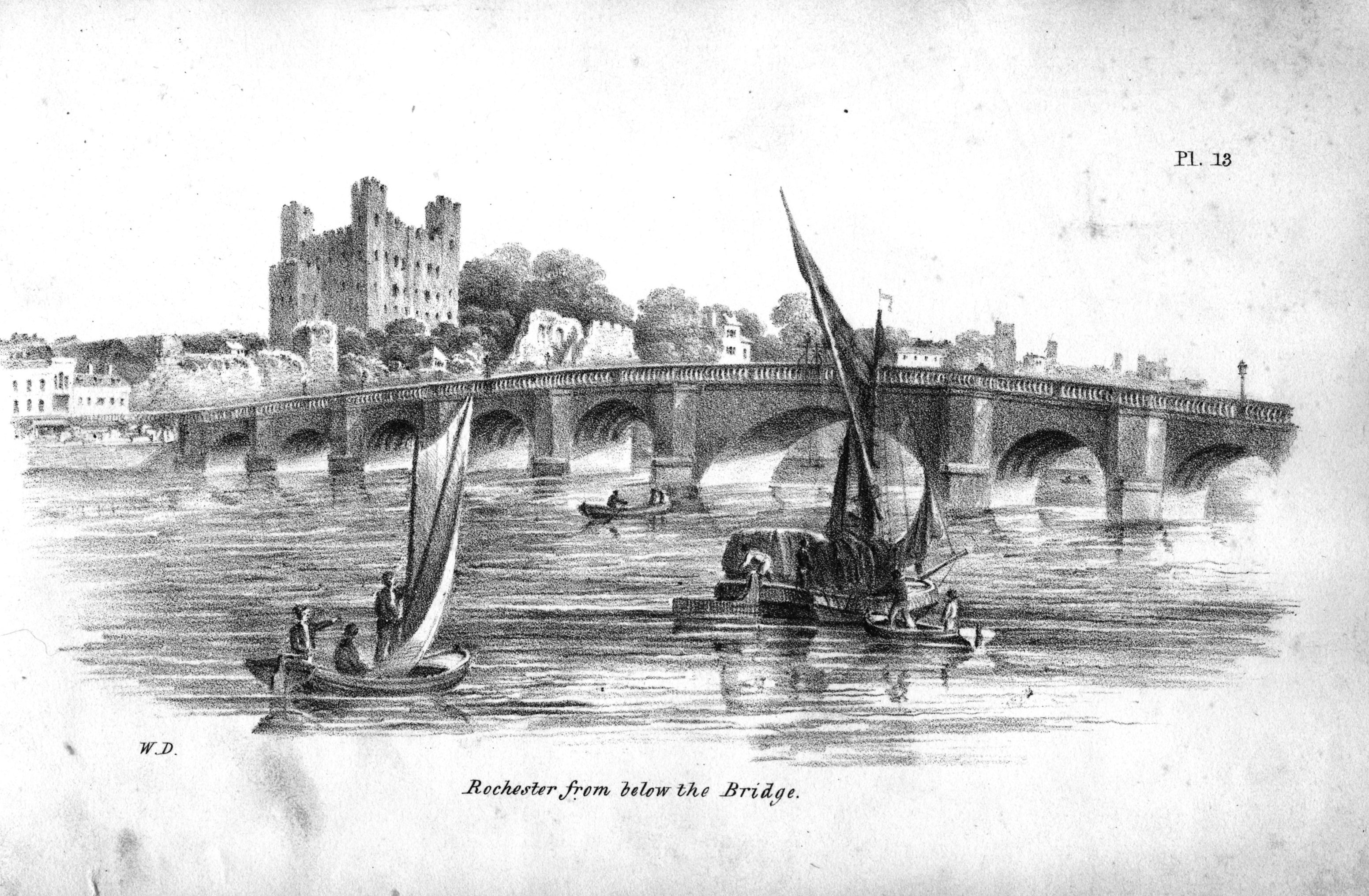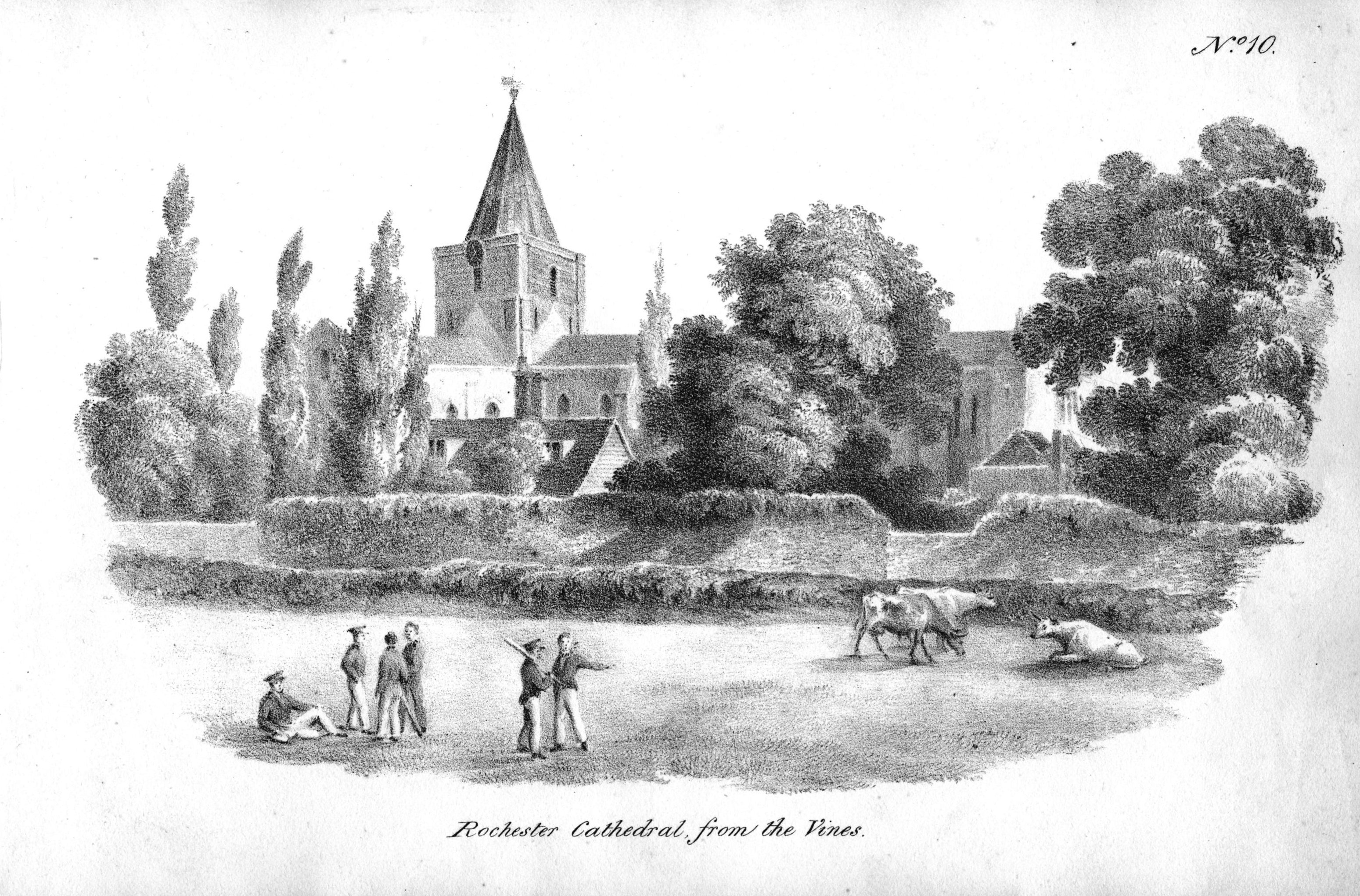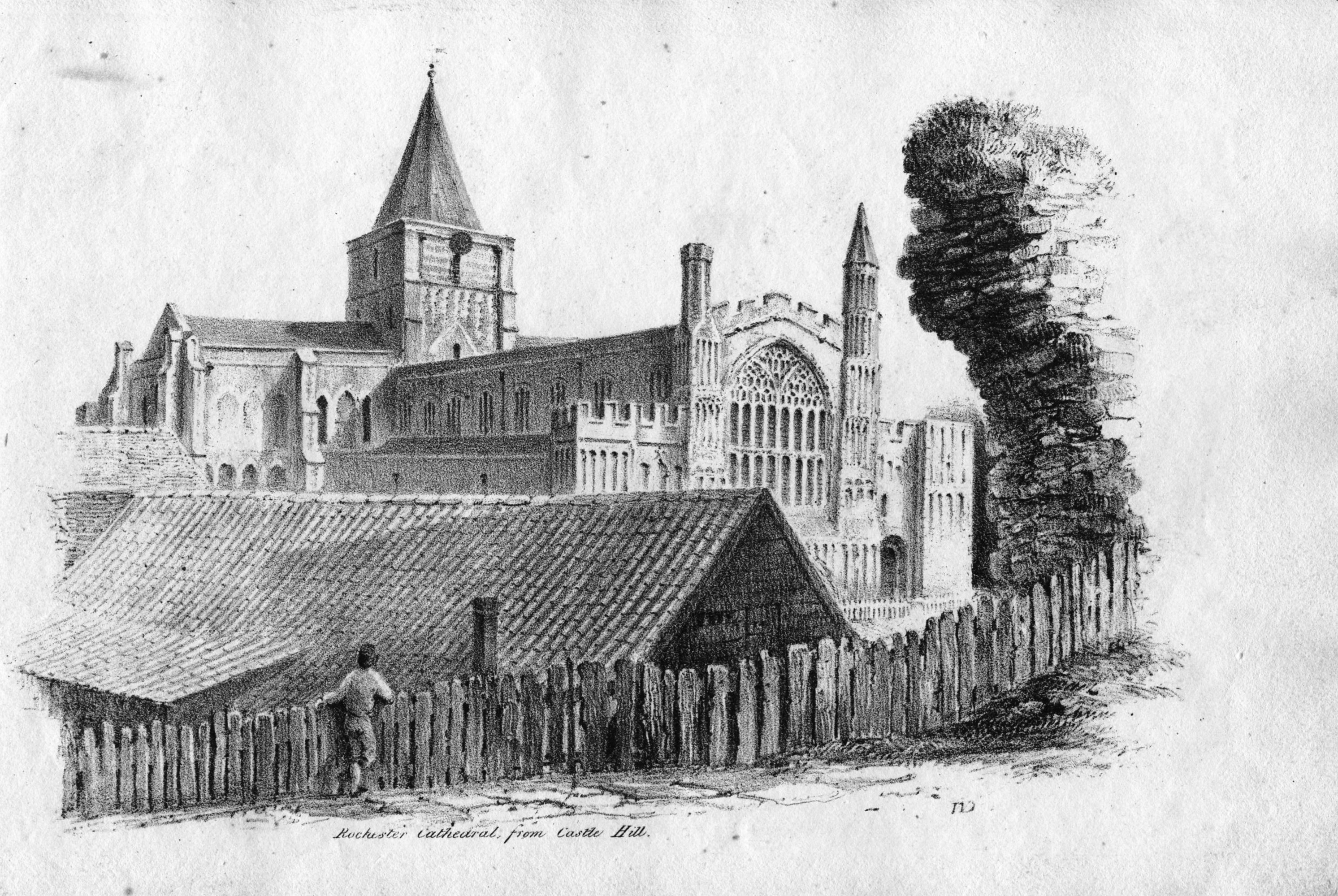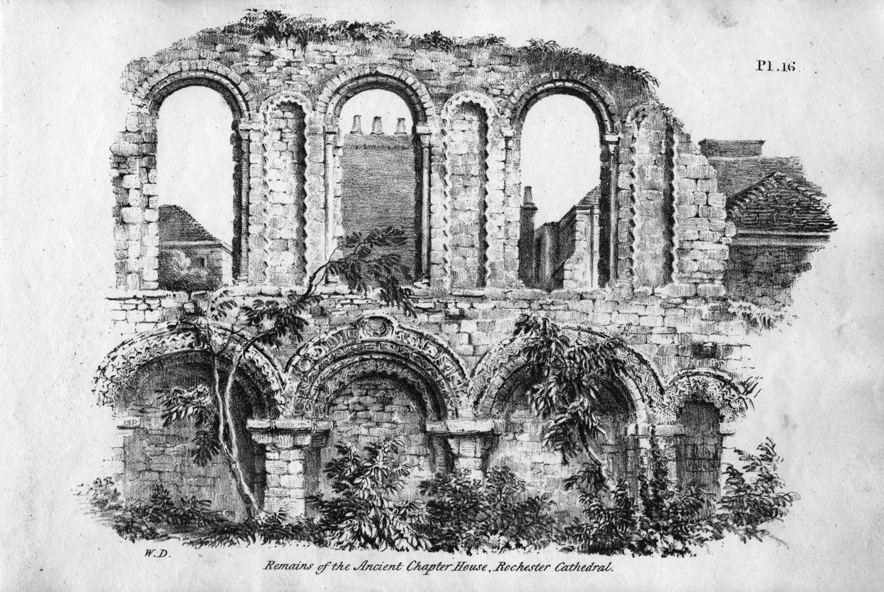 Book of lithographic prints of sketches of Rochester by William Dadson, 1825; in later binding; incomplete set: (no title page), plates no.1 to 16; presented by the artist Emilie Carlyon, who has added some faint sketches of Eastgate House interior. Some light staining & fraying of print edges. There seem to have been over 20 prints in this series originally.