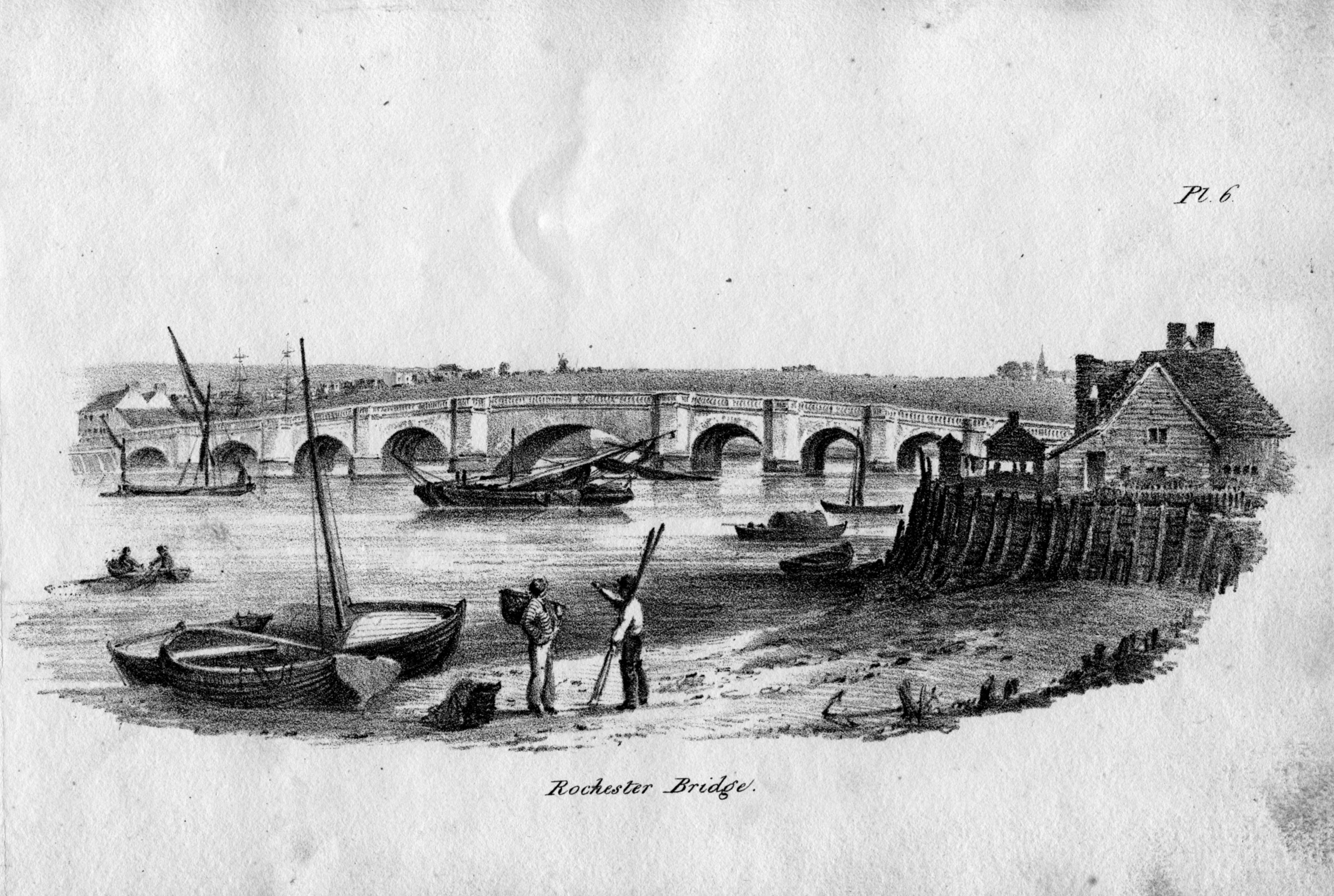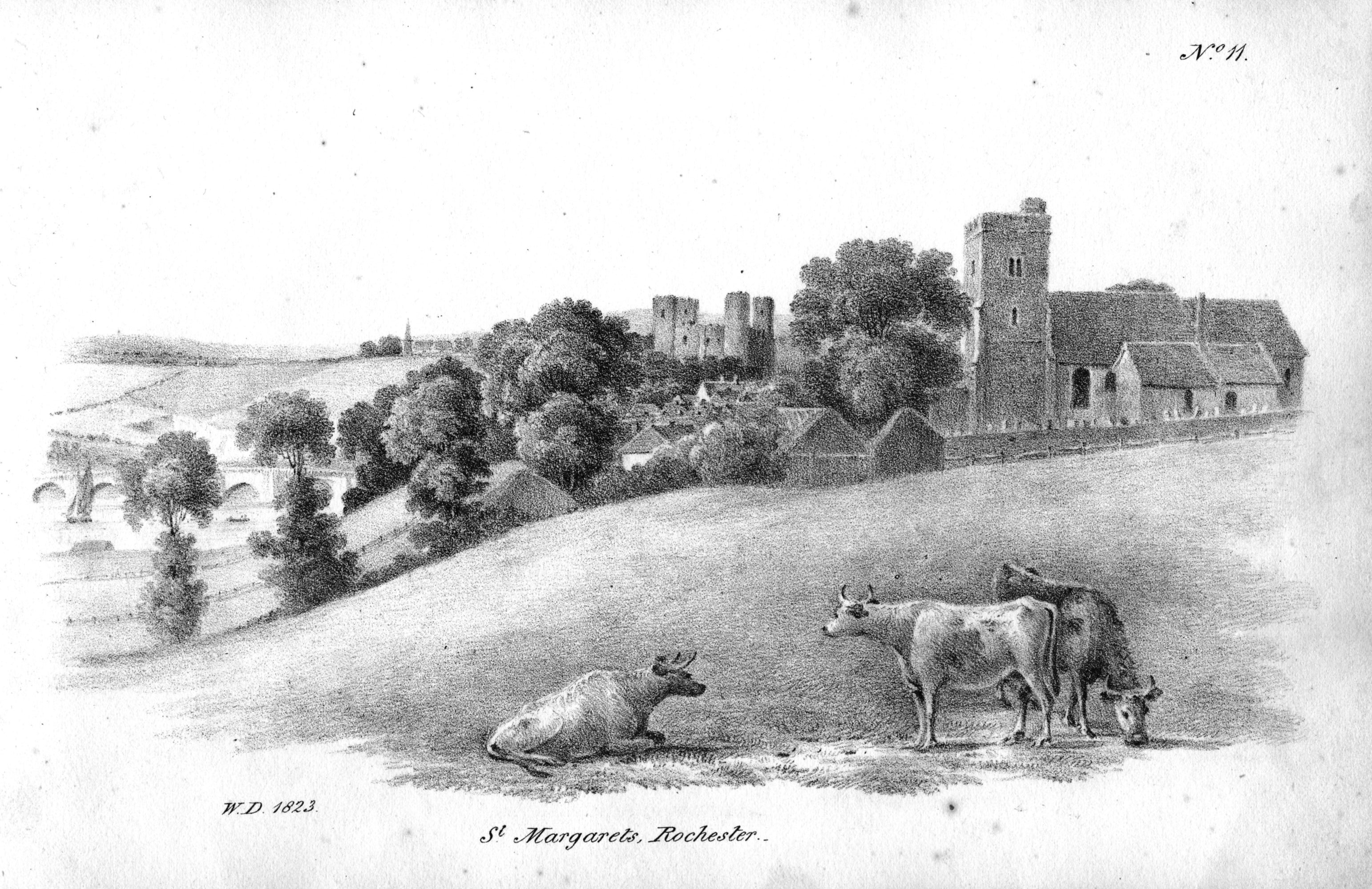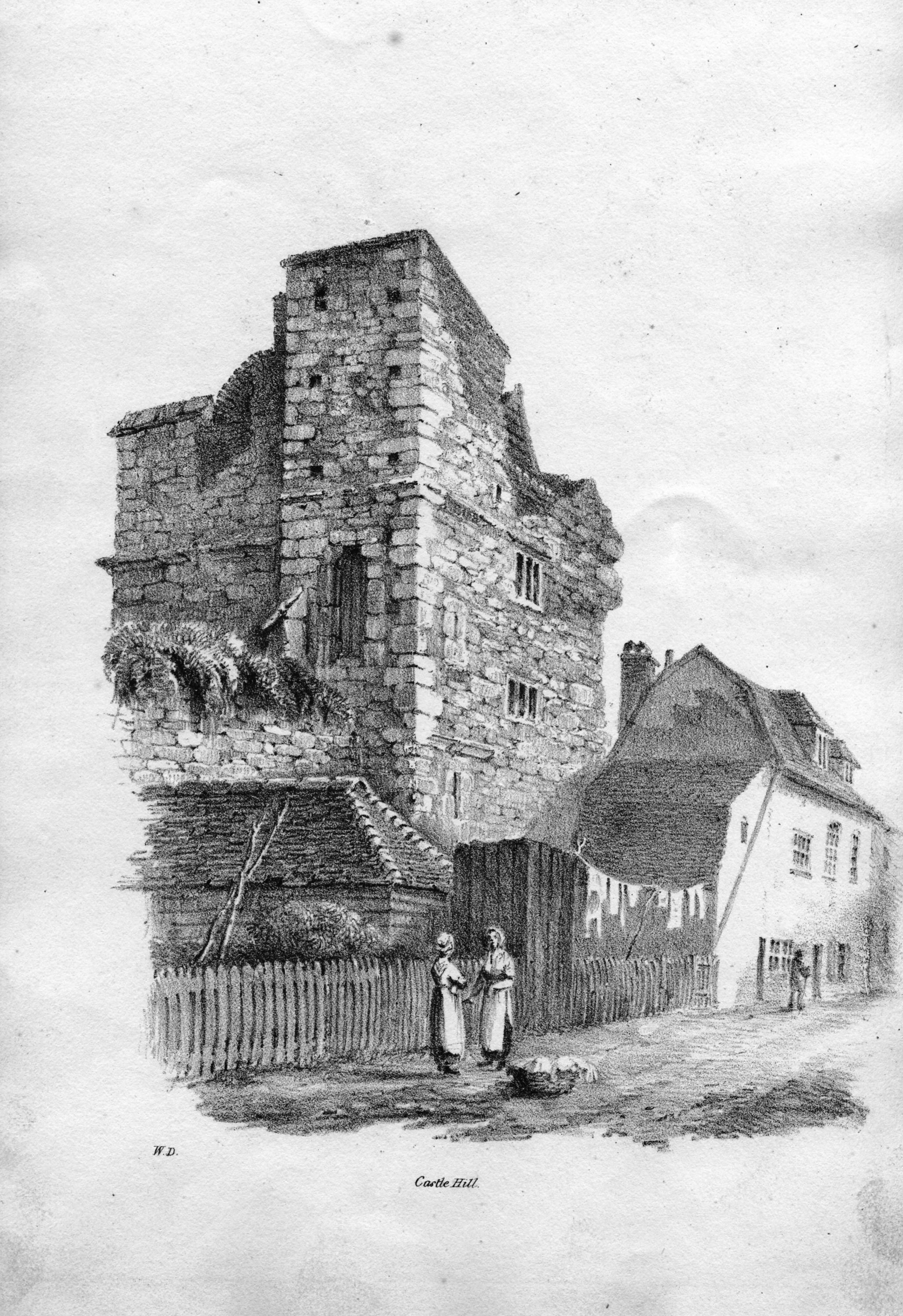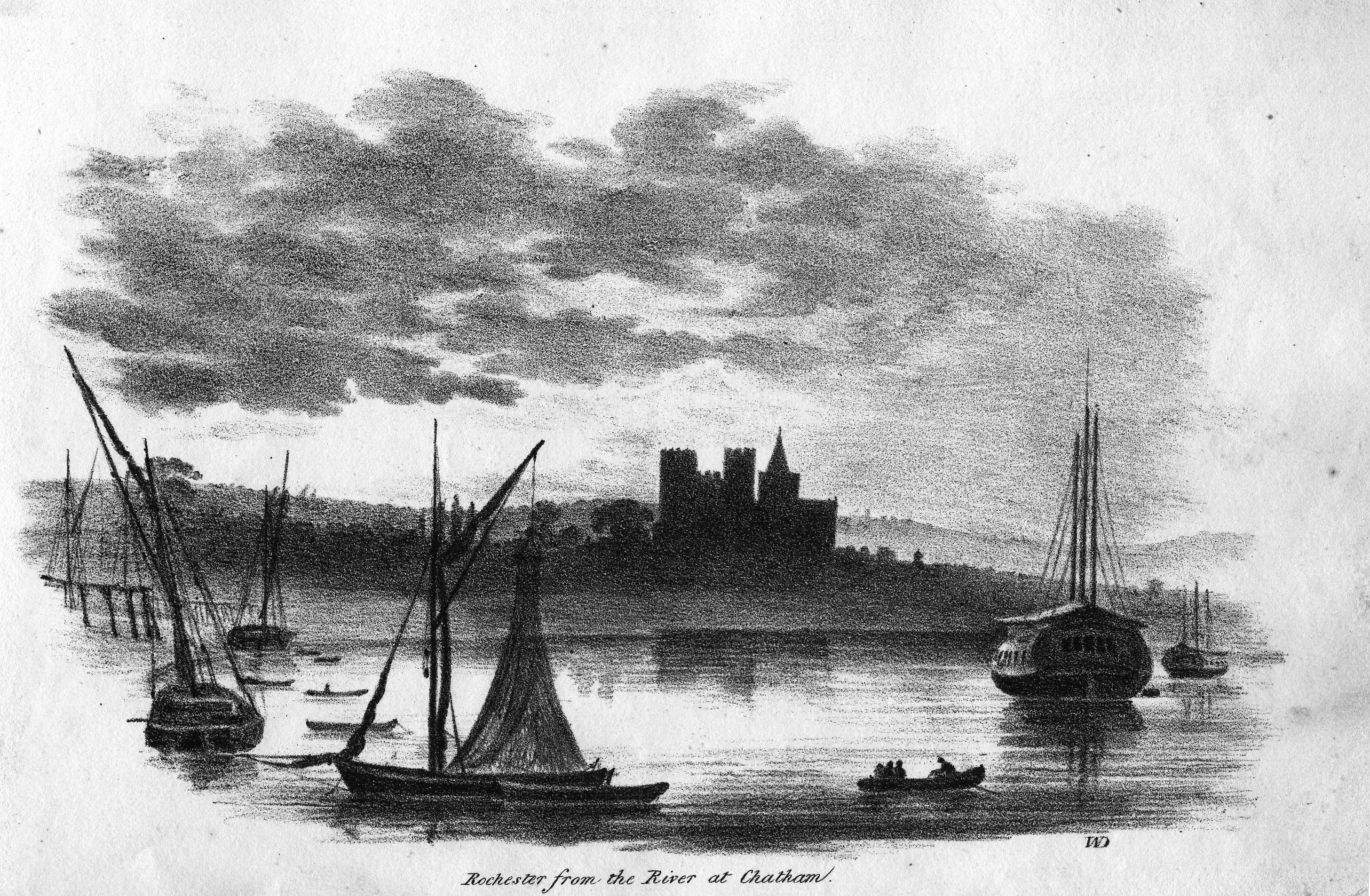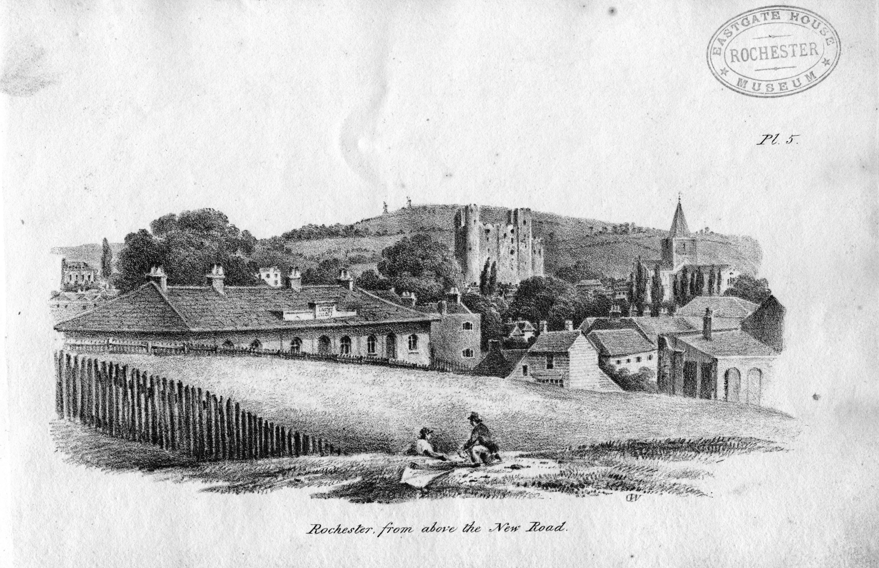 Book of lithographic prints of sketches of Rochester by William Dadson, 1825; in later binding; incomplete set: (no title page), plates no.1 to 16; presented by the artist Emilie Carlyon, who has added some faint sketches of Eastgate House interior. Some light staining & fraying of print edges. There seem to have been over 20 prints in this series originally.
