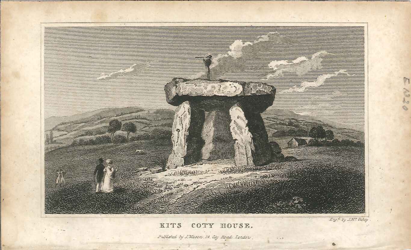 - DescriptionEngraved print of Kit's Coty megalith; stones of a long barrow; hopelessly out of scale figures on & around the monument (including dwarf with telescope!); bluebell Hill beyond.