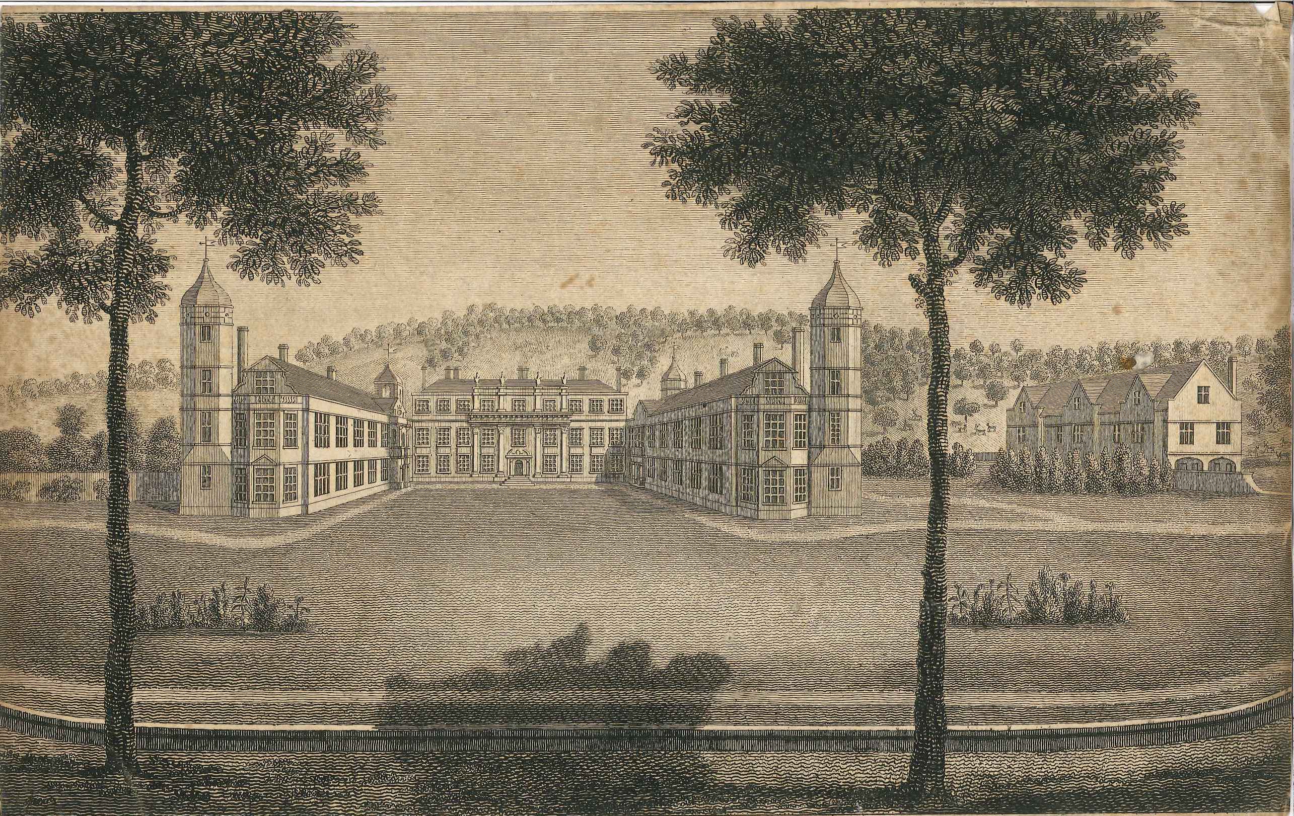 - DescriptionEngraved print of Cobham Hall, seen across parkland; the rather symmetrical perspective suggests a mid or early 18th century date; print has been trimmed, no artist or engraver's details.
