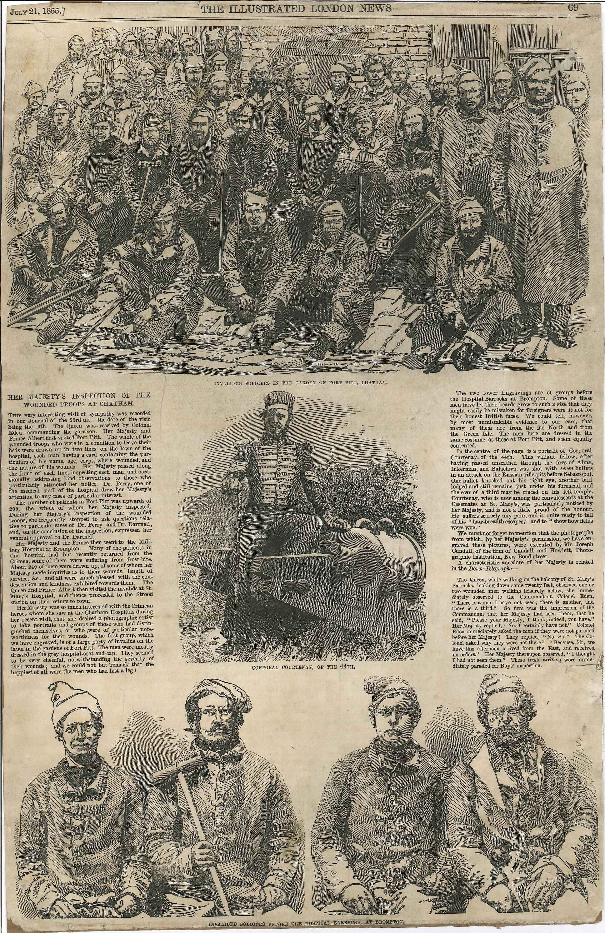 - DescriptionPage from the 'London Illustrated News' shows pictures of wounded British soldiers from the Crimean War; text about inspection by Queen Victoria; 3 engraved images derived from photographs taken by Joseph Cundall. Backed on to 1920's newspaper.