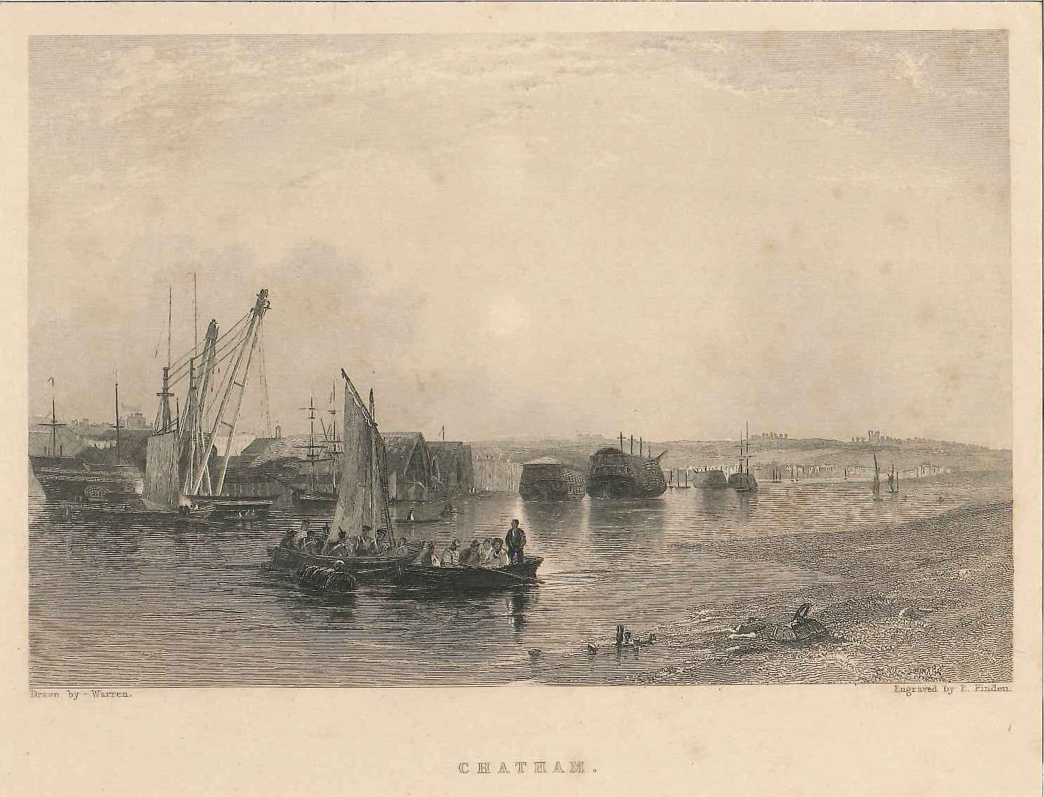 - DescriptionPrint of a view of the River Medway at Chatham; shows two rowing boats with sailors & civilians, various Navy vessels & sheds beyond.