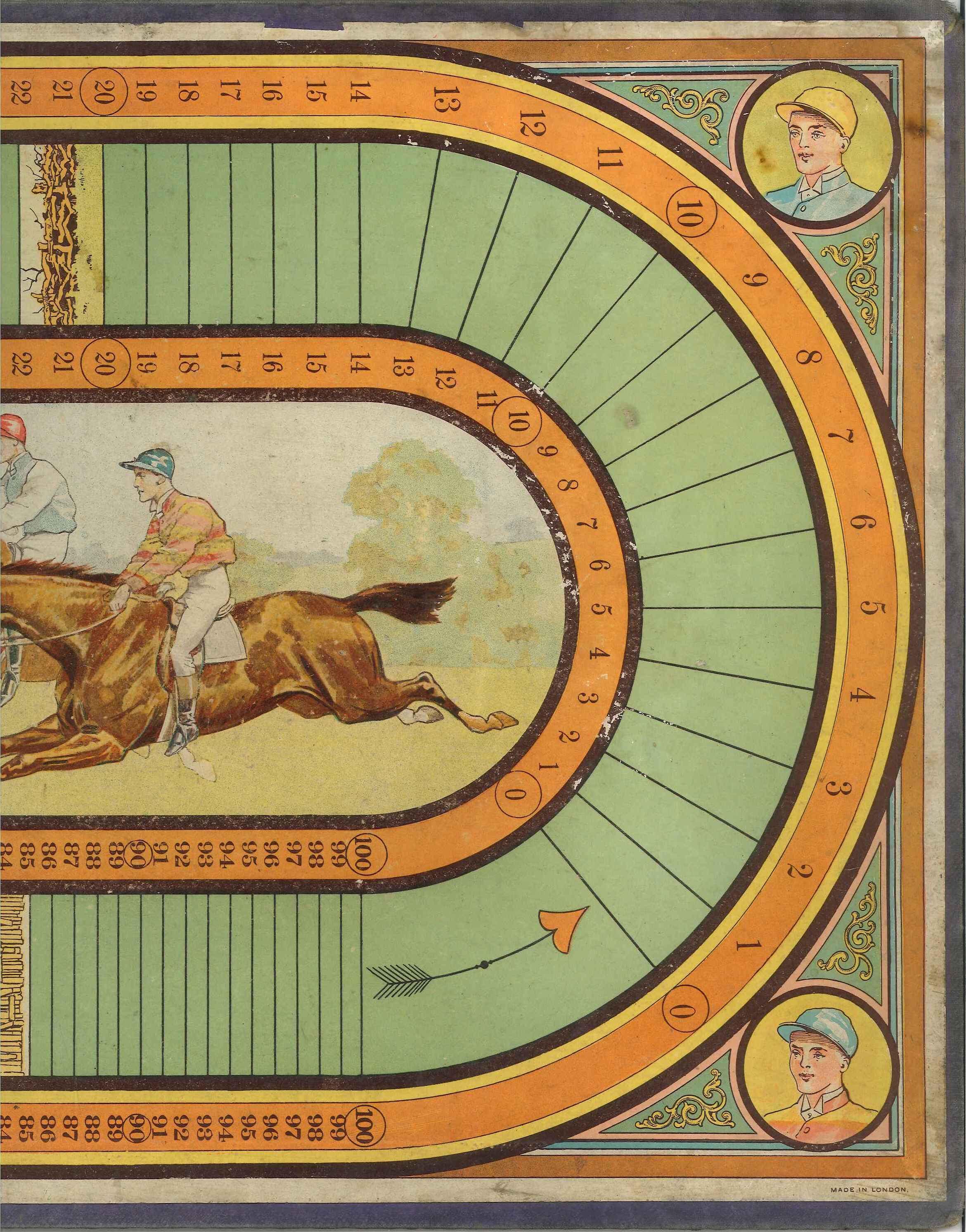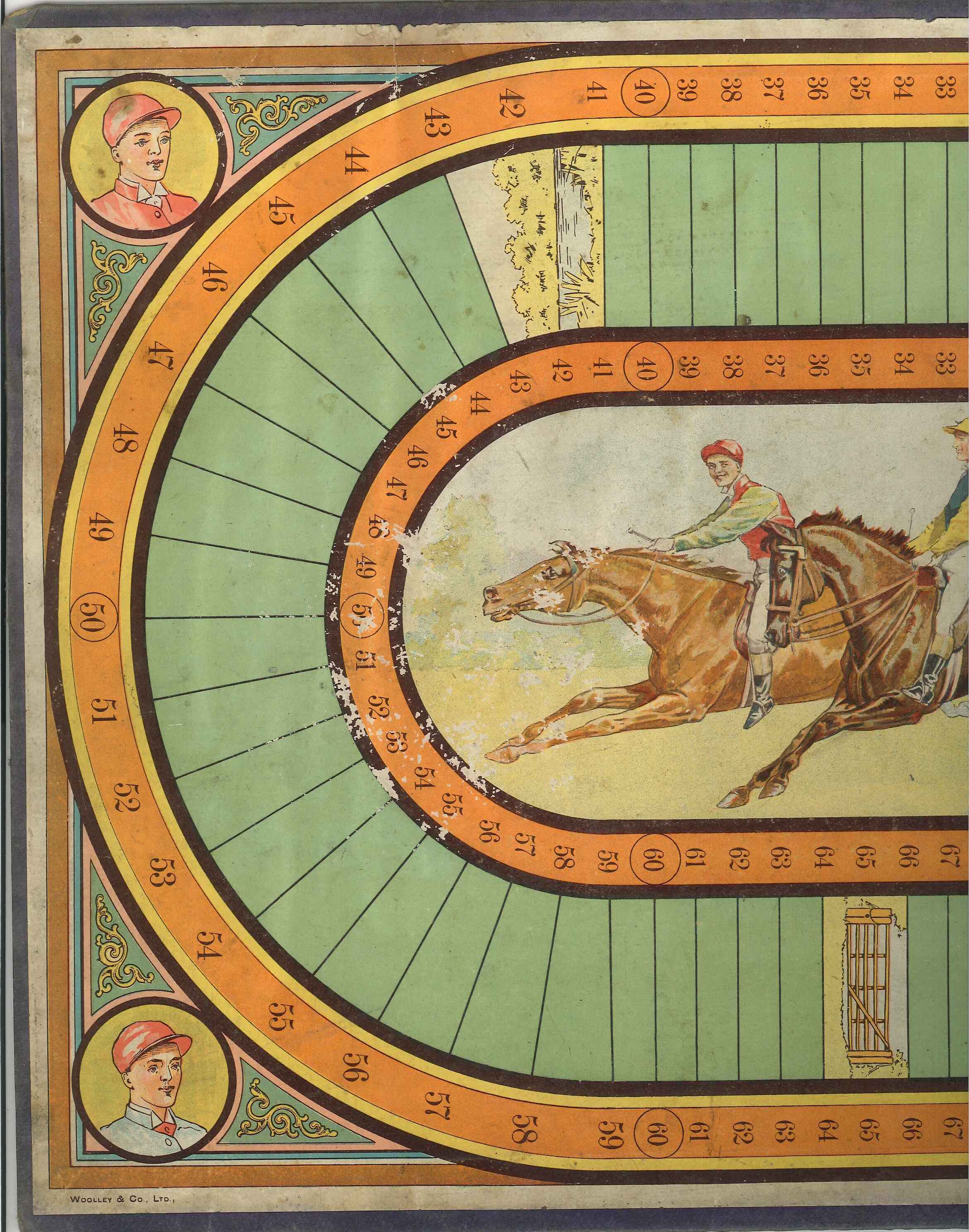 - DescriptionHorse racing' board game; board marked out as race track, with various jumps; 5 small lead alloy horses with jockeys in a wooden die shaker, the board has almost separated down the central fold.
