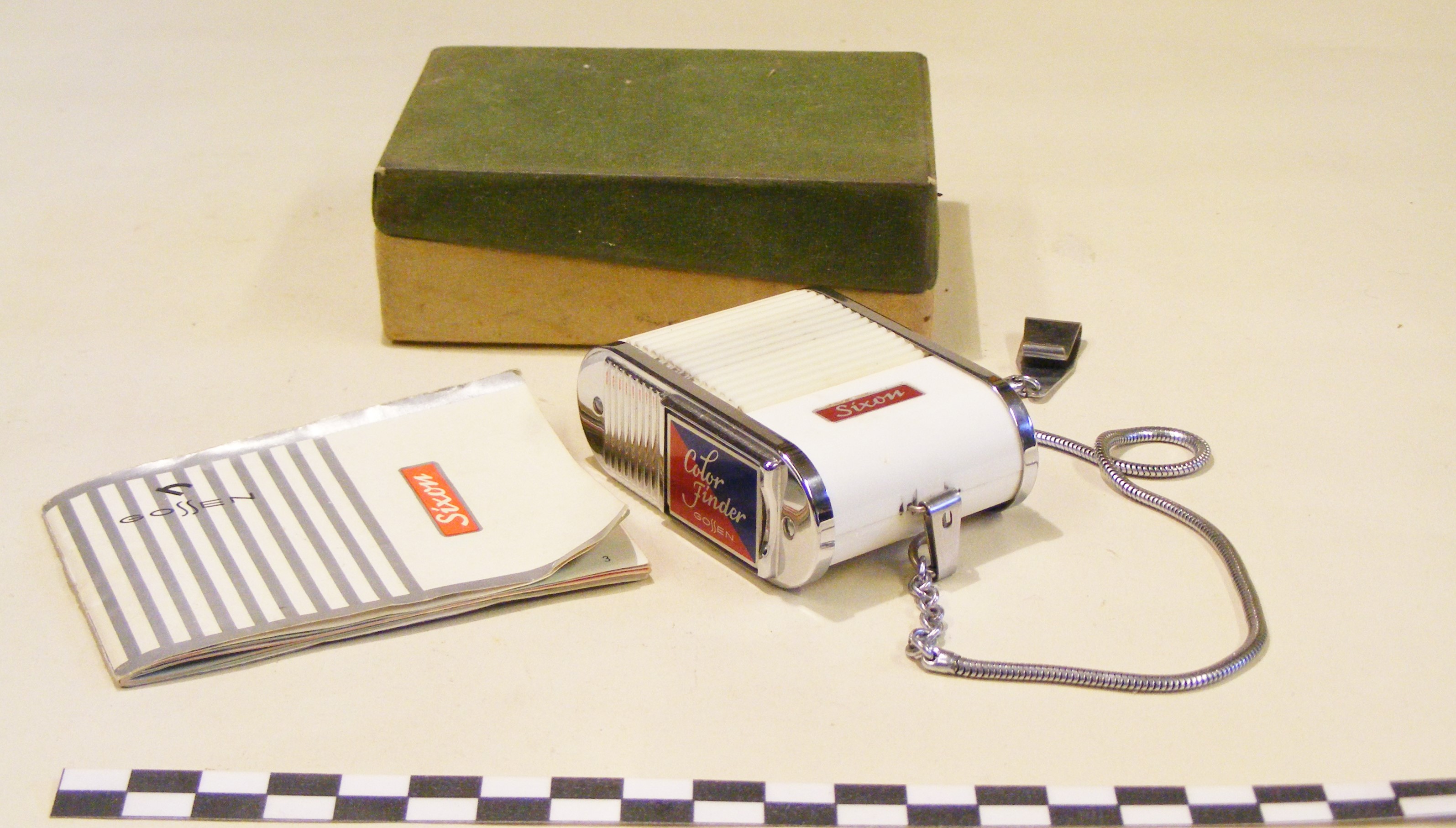 - DescriptionPhotographic light meter; a 'Sixon' selenium meter, made by Gossen in Nuremberg, Germany; this the 'Color Finder' model, complete with box & instructions.