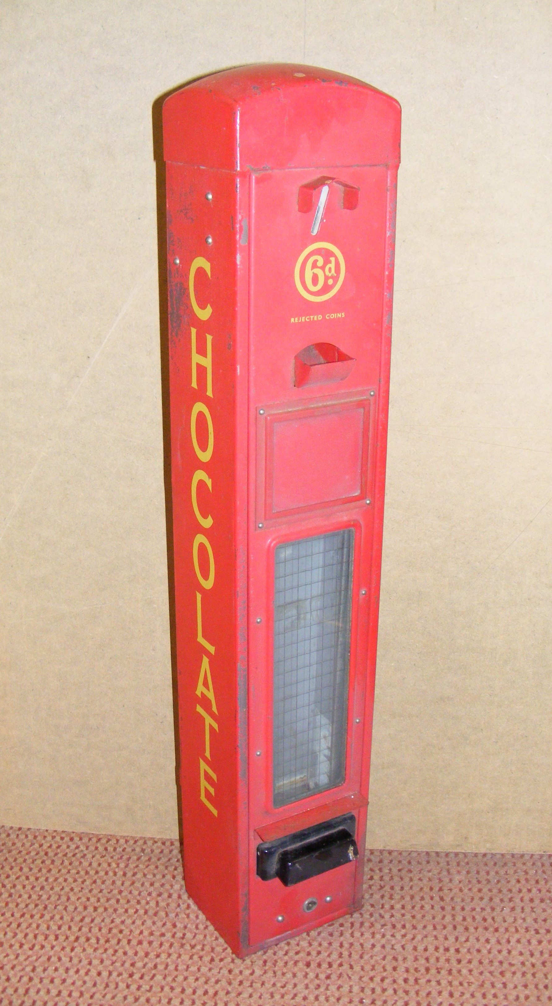 Red-painted metal chocolate vending machine; charged 6d per transaction; numbered '6636'.