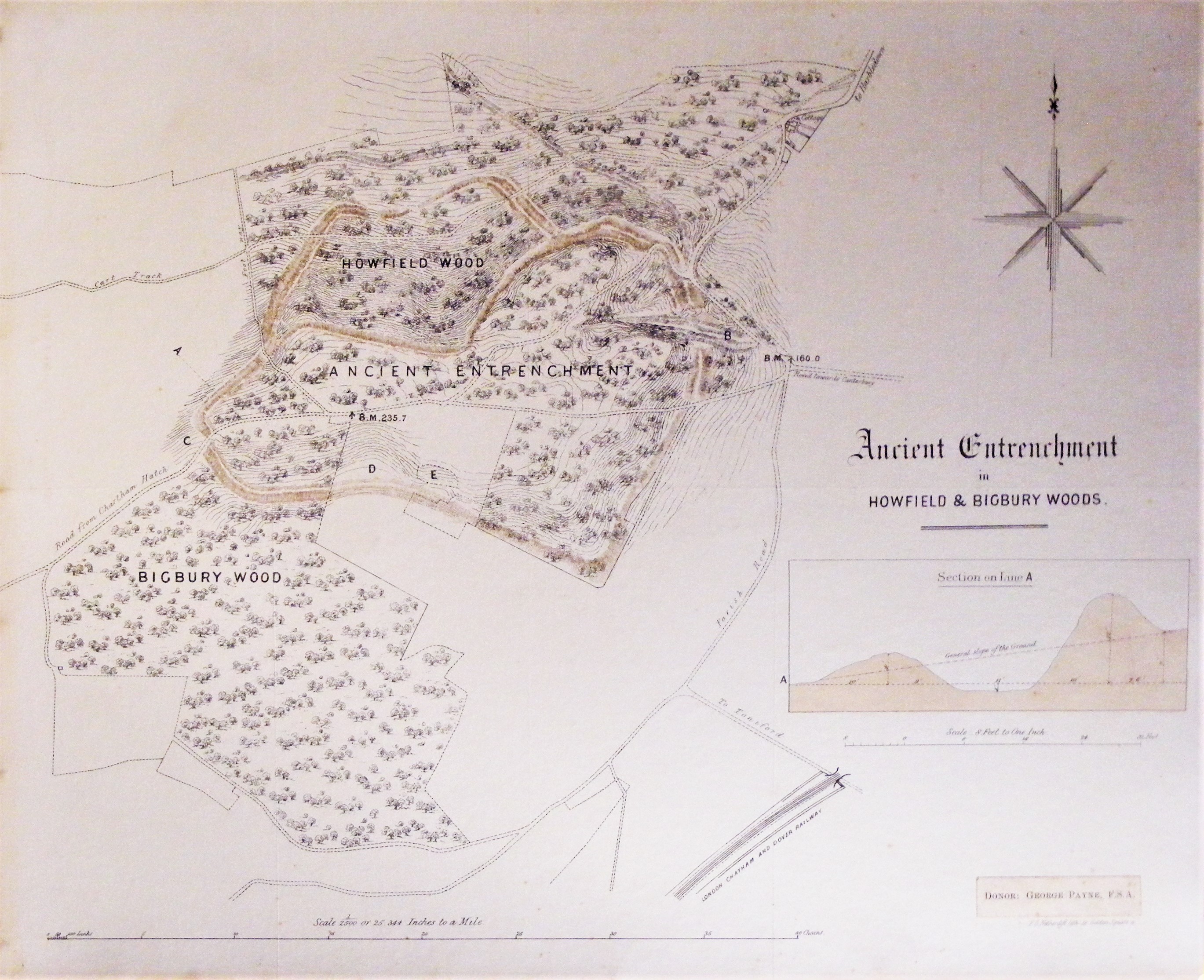 - DescriptionLithographic print of a plan of Bigbury hillfort, near Harbledown, Canterbury; scale plan showing Bigbury & Howfield Woods; section through ramparts. Mounted on board.
