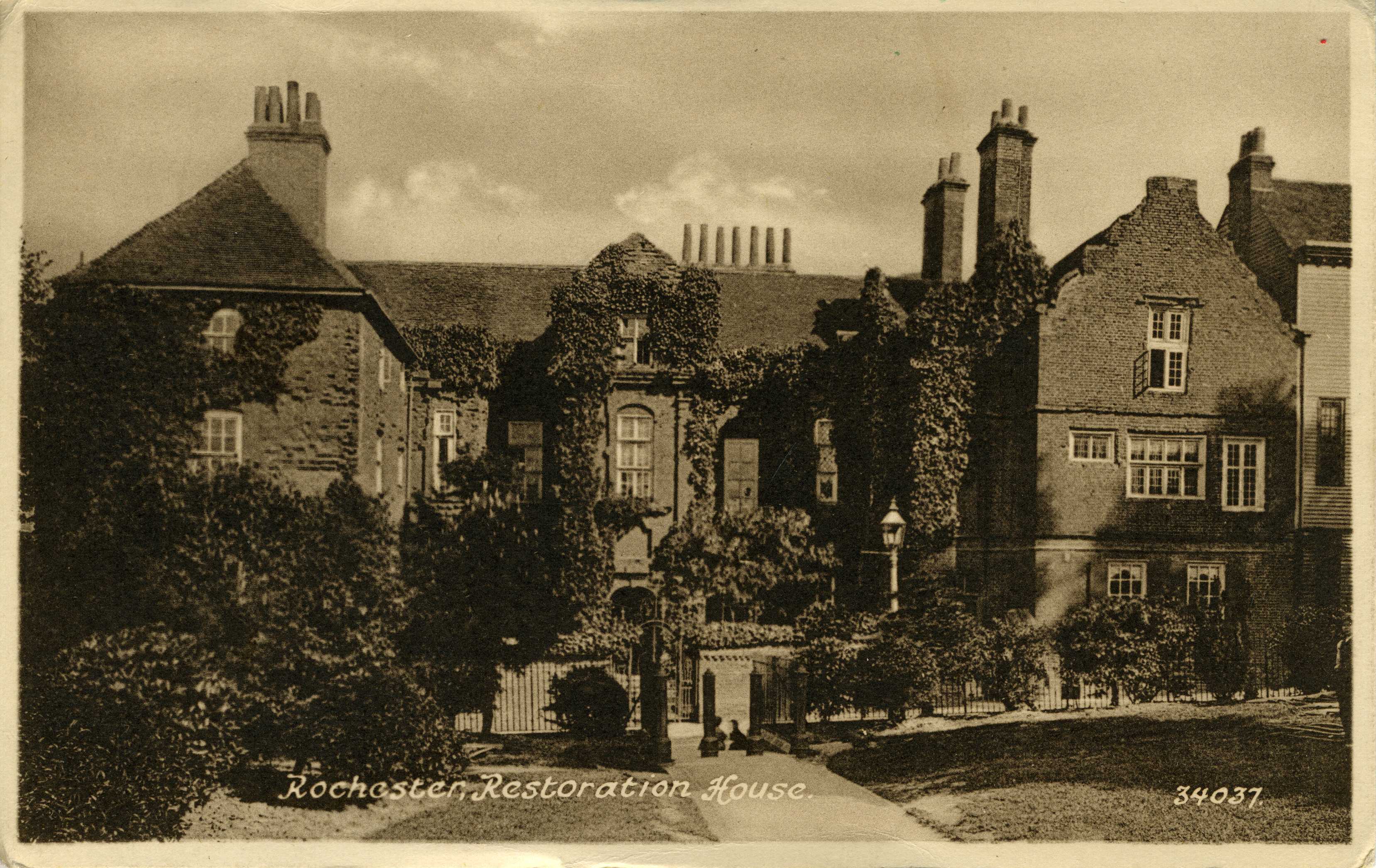 - DescriptionPostcard print of Restoration House in Rochester; monochrome, sepia tint; shows a view taken in 1894, this card being a later print.