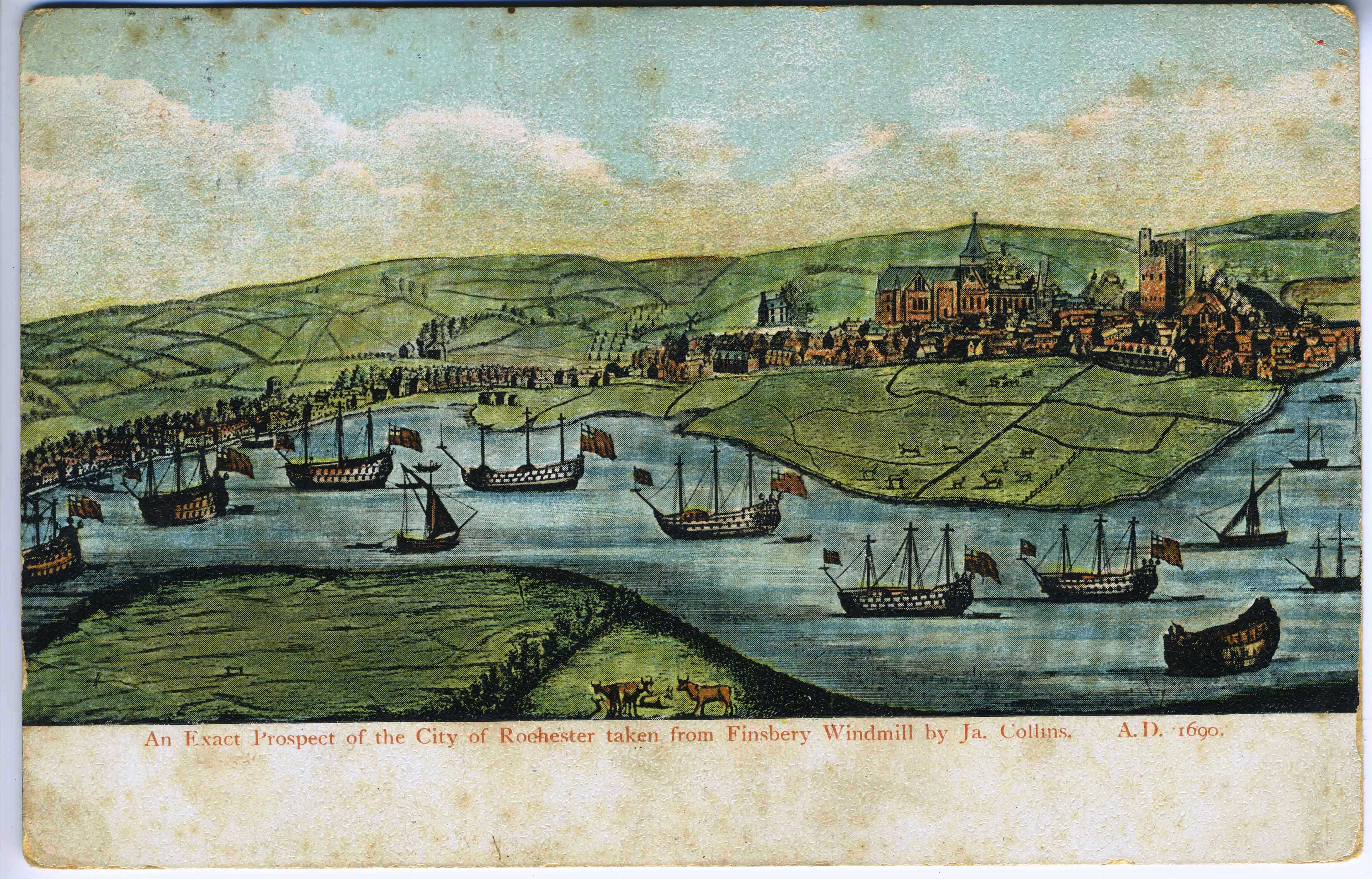 - DescriptionPostcard print of the view of Rochester from Frindsbury by James Collins, c.1700; originally a monochrome engraving, this card is a simple colourised version.
