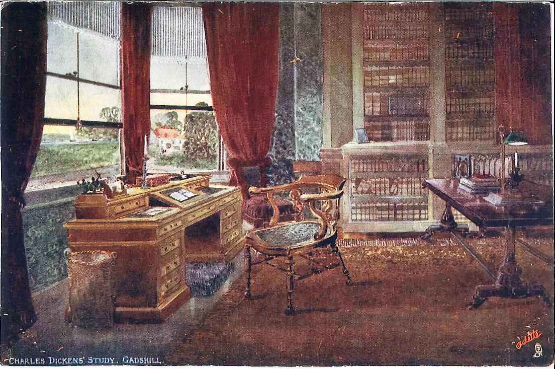 - DescriptionColour print of a watercolour of Gad's Hill House study, near Rochester, where Charles Dickens lived; printed as a postcard; shows a view of the study very similar to 'The Empty Chair' by Sir S L Fildes.