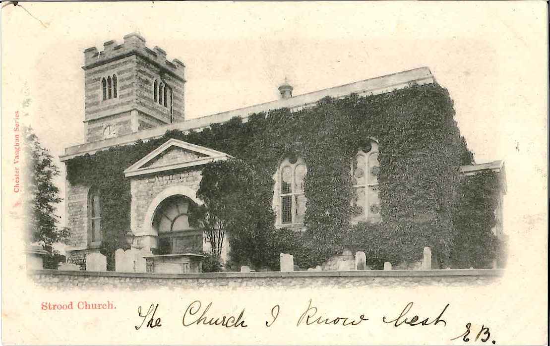 - DescriptionPostcard; monochrome photographic image of Strood church, ivy clad; the corresponder has annotated the card 'The Church I know best'