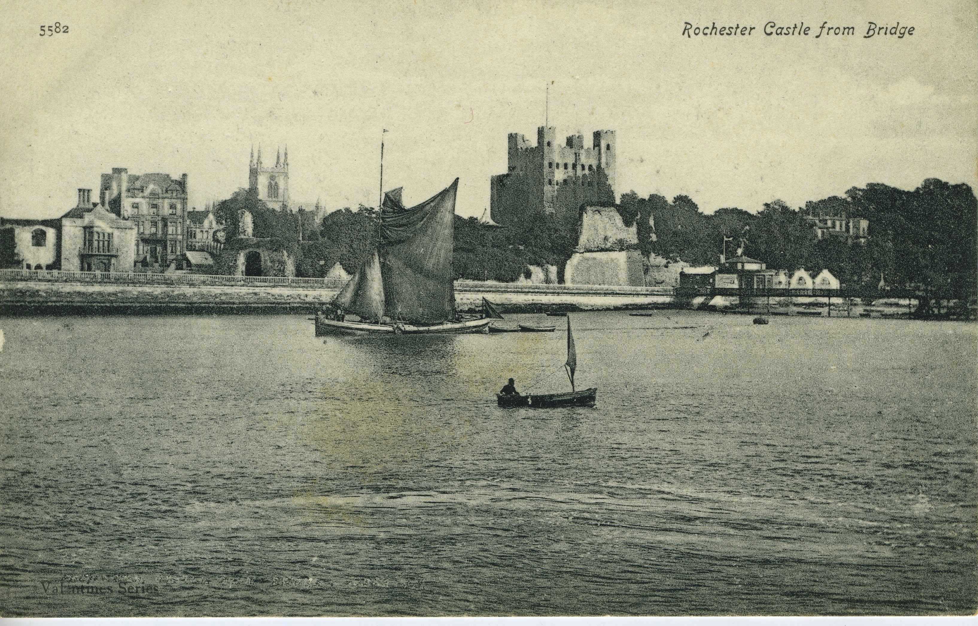 - DescriptionPostcard; monochrome photographic image; view of Rochester across the river from the bridge; shows Bridge chapel, pre-1904 cathedral tower & castle; barge & fishing boat on river.