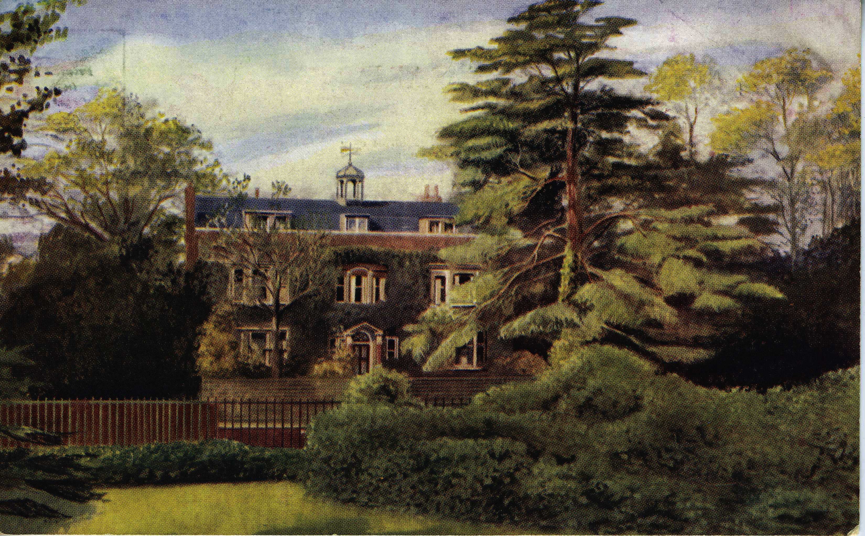 - DescriptionPostcard; colour printed image of a watercolour of Gad's Hill Place, near Rochester, formerly the home of Charles Dickens; shows a view from the front, from the park across the road; view is post-1924.