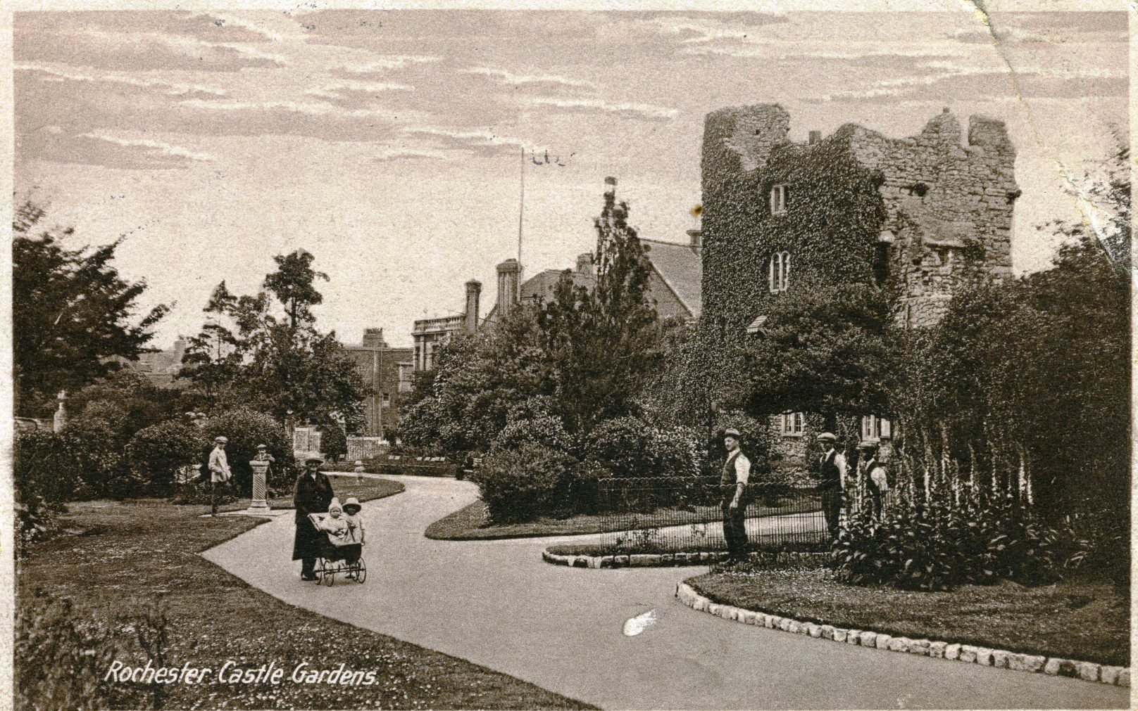 - DescriptionPostcard; monochrome photographic image of Rochester castle gardens, shows an ivy-clad tower in the bailey, & a winding path through the flowerbeds & shrubs. Posted in 1925.