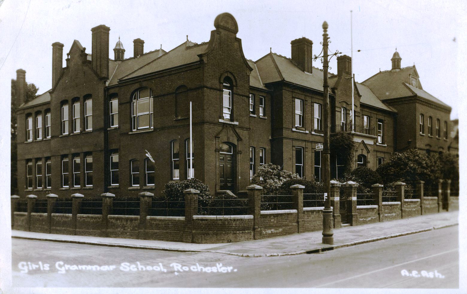 - DescriptionPostcard; monochrome photographic image of the Girls Grammer School in Rochester (opened 1889); post-1908 view.