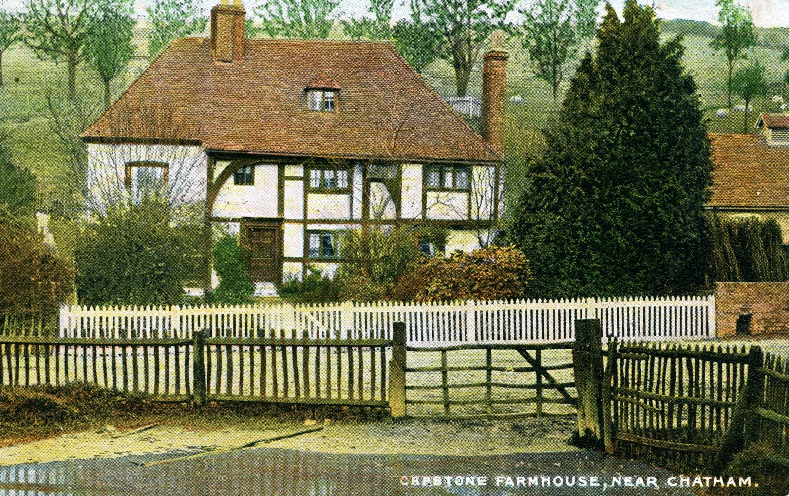 - DescriptionPostcard; monochrome photographic image (lightly colourised) of Capstone farmhouse, near Chatham; shows tiled & timber-framed house by the road with white fence; orchard beyond.