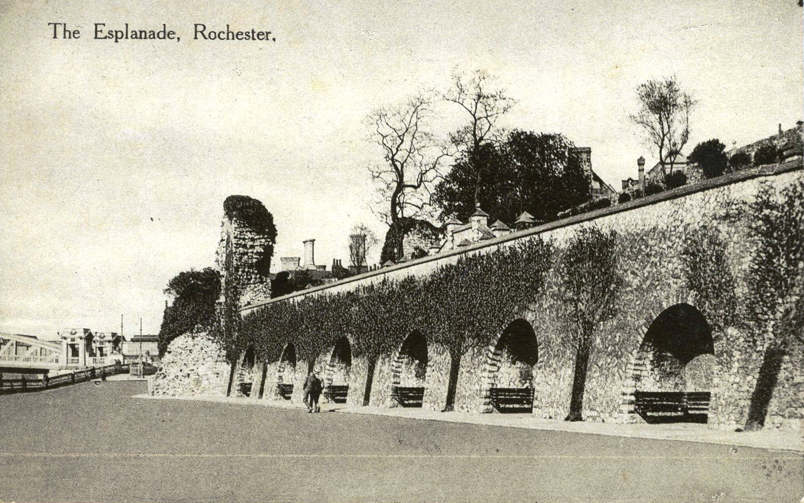- DescriptionPostcard; monochrome photographic image of Rochester esplanade, with benches in the supporting arches; in the background is the 1914 Rochester bridge.