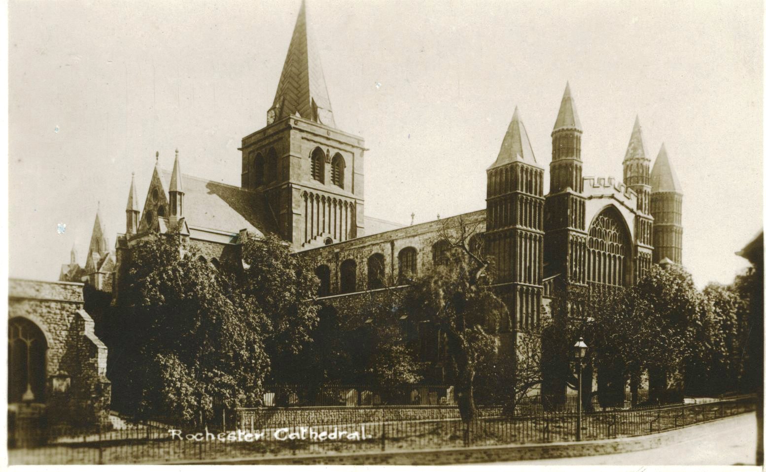 Postcard; monochrome photographic image of Rochester cathedral after the 1904 restoration of the spire.
