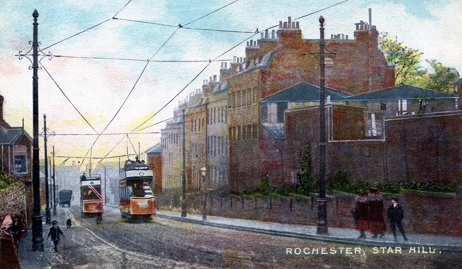 - DescriptionPostcard; monochrome photographic image (lightly colourised) of Star Hill in Rochester; showing trams on the hill (installed in circa 1902-1908); highly 'treated' image, with added colour & texture (especially figures)