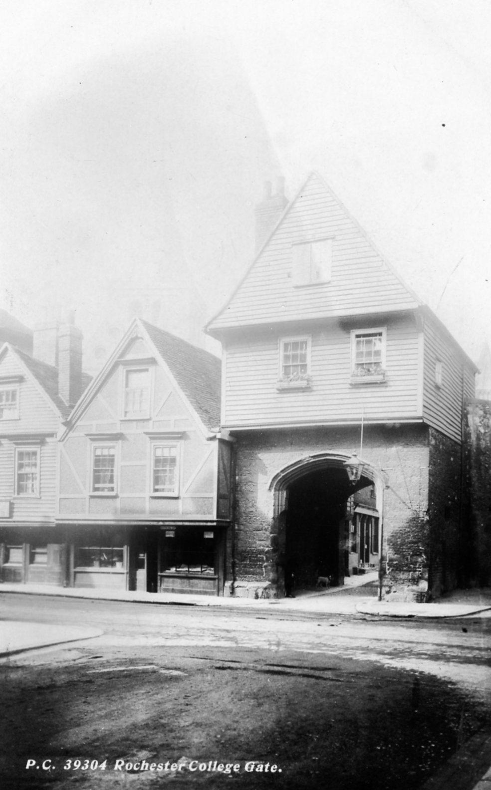 - DescriptionPostcard; monochrome photographic image; view of College Gate ('Jasper's gatehouse') in Rochester High Street.