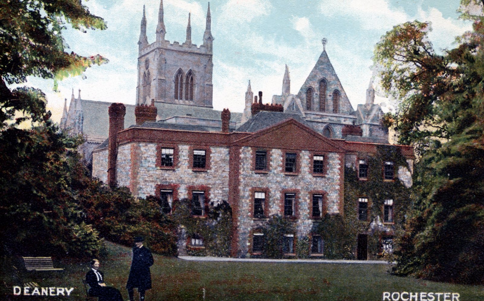 - DescriptionPostcard; monochrome photographic image (colourised) of the deanery in Rochester; shows an elderly couple in the foreground; behind is the cathedral with the 1826-1904 configuration tower (pinnacles, not spire).
