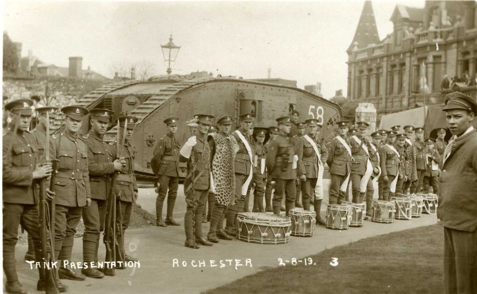 - DescriptionPostcard; monochrome photographic image of the presentation of a World War One tank (no.58) to Rochester on 2/8/1919; shows a close-up of the tank, with the military escort & band at rest next to it.