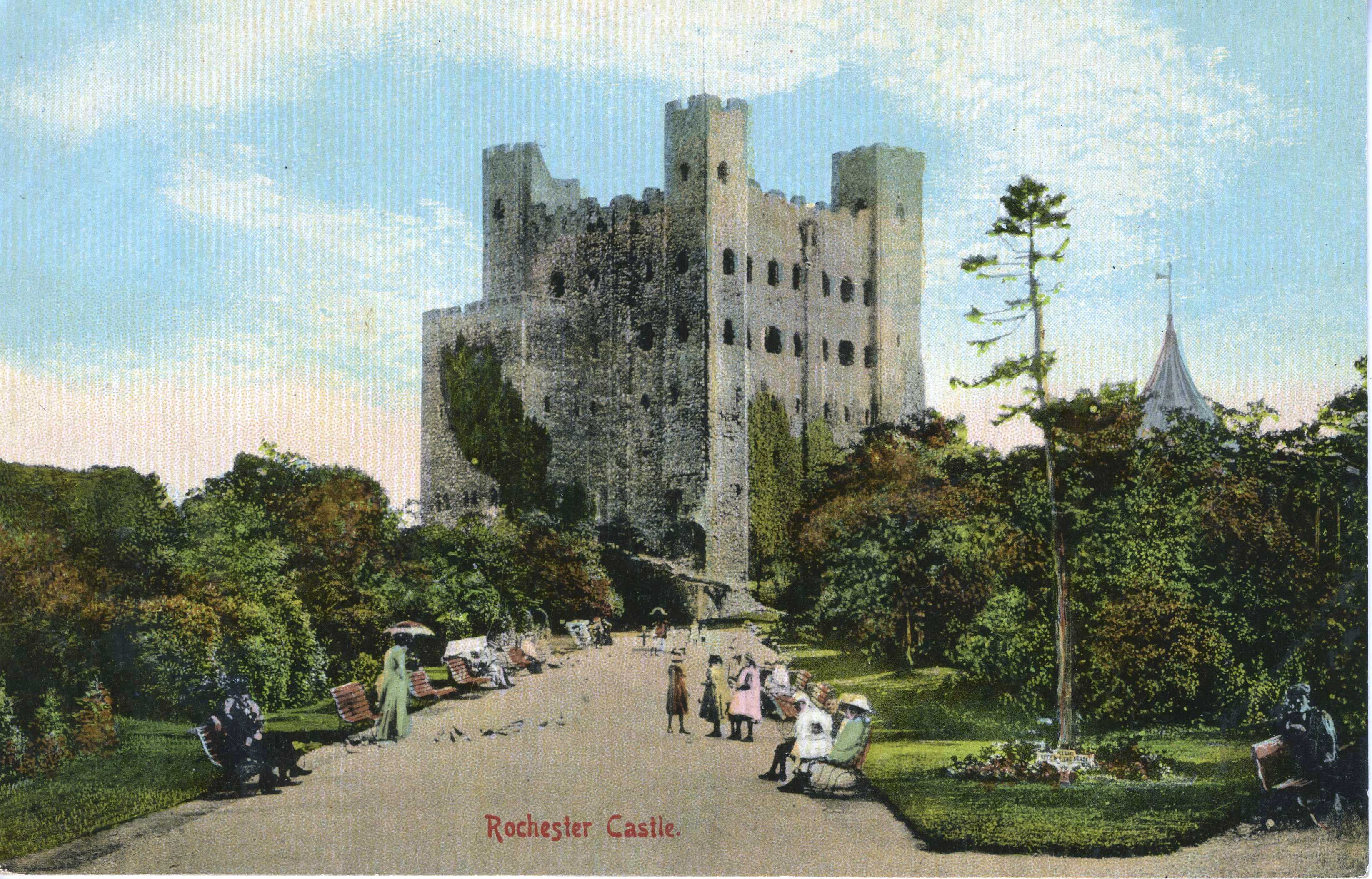 - DescriptionPostcard; monochrome photographic image, lightly colourised; shows Rochester castle keep & gardens, quite dense shrubbery; various visitors, seated & standing, feeding pigeons, etc; image is circa 1900-1910. Transferred from Local Studies, Central Library, High Street, Bromley.