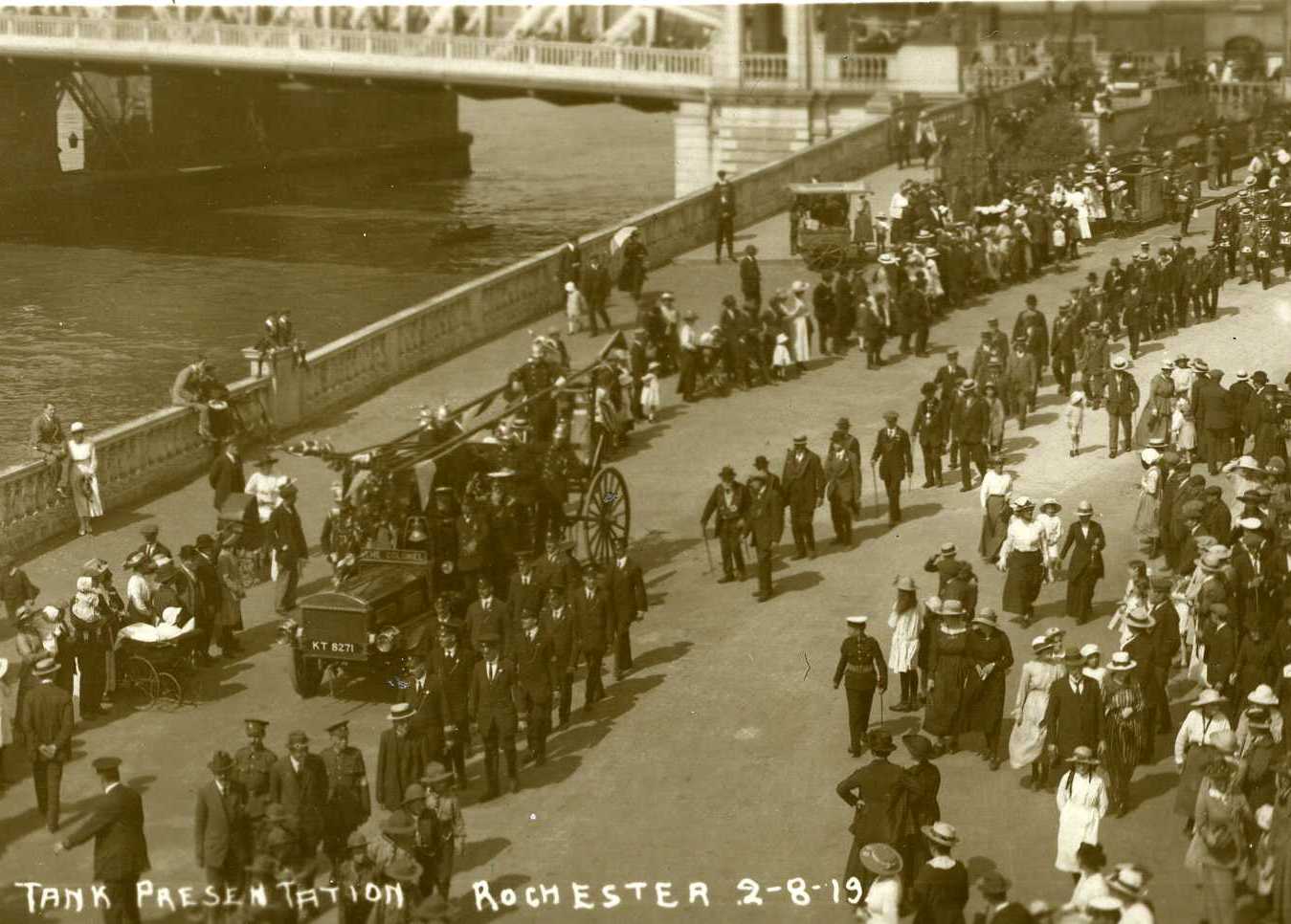 Postcard; monochrome photographic image of the presentation of a World War One tank (no.58) to Rochester on 2/8/1919; shows the parade on the esplanade, with the Rochester fire engine (KT8271, 'The Colonel'); In a small album with a dedication to 'A.K. From H.B. Aug:1919' ['A. K' is Apsley Kennette, Town Clerk, 'H.B.' Harry Breton, then Mayor]. A7151/13-18 are all taken from the same location, the castle gardens overlooking the esplanade.