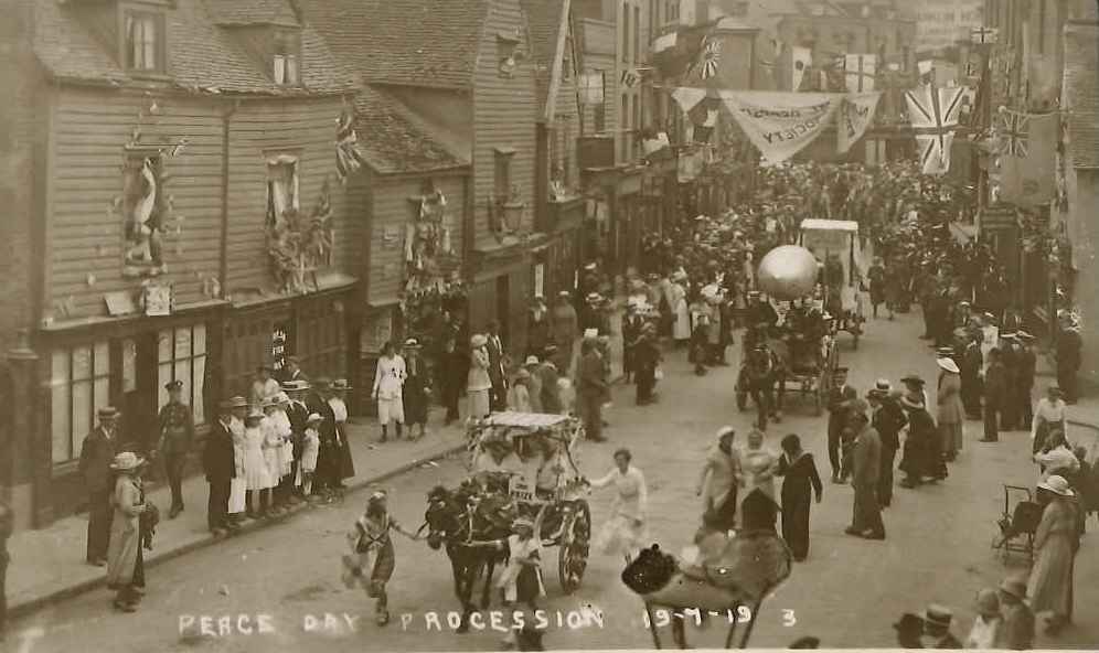 Postcard; monochrome photographic image of the Peace Day procession of 19/07/1919; shows the progress along Rochester High Street, several ornate floats approach; flags overhead, people line the roadside. In a small album with a dedication to 'A.K. From H.B. Aug:1919' ['A. K' is presumably Apsley Kennette, Town Clerk]. A7151/1-7 shows the progress of the parade photographed from the same spot on the High Street.