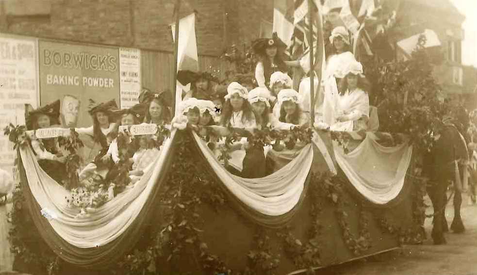 Postcard; monochrome photographic image of the Peace Day procession of 19/07/1919; shows a close-up of one of the prize-winning parade floats, girls in costume, and signs saying 'Alsace' & 'Lorraine'. In a small album with a dedication to 'A.K. From H.B. Aug:1919' ['A. K' is presumably Apsley Kennette, Town Clerk, 'H.B.' is presumably Harry Breton, then Mayor].