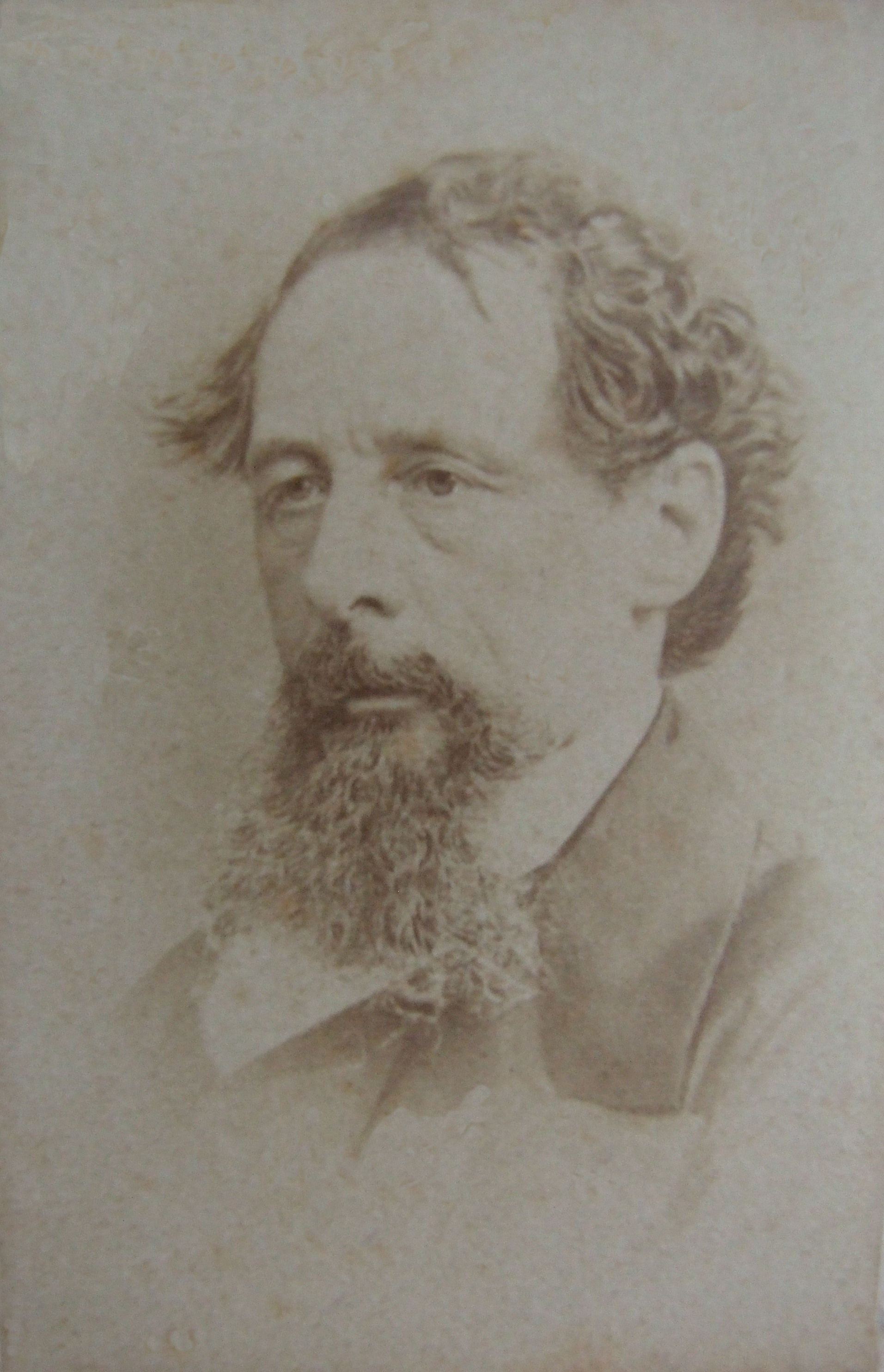 Ephemera; photograph of Charles Dickens; albumen print, 'carte de visite' card; picture taken circa 1860's; published R W Thrupp of Birmingham. Acquired and displayed at the museum in the early 20th century. These cards were very popular in the 1860's, & could be traded among friends & visitors, and collected & displayed in albums - the craze was known as 'Cardomania'.