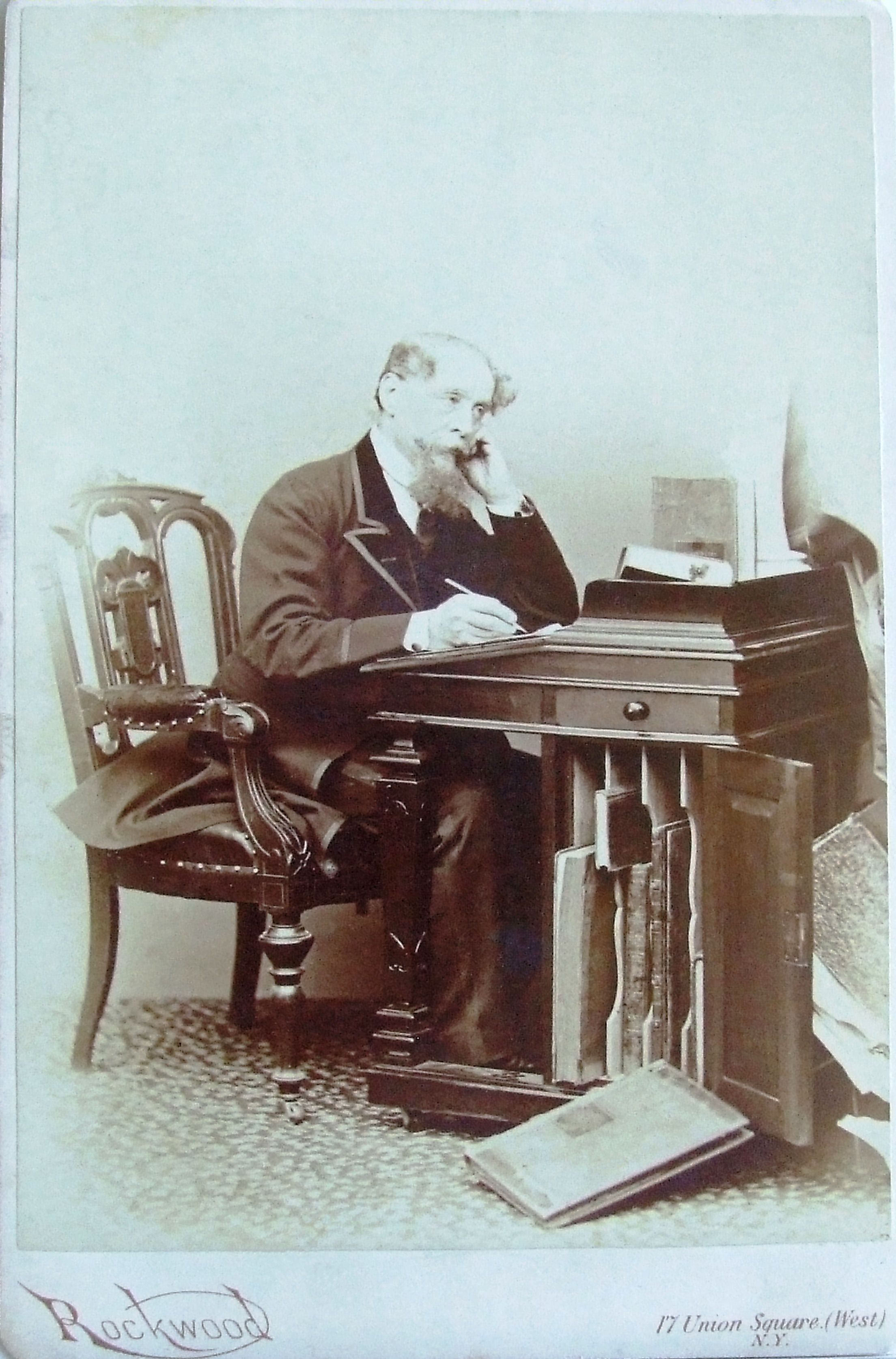 Ephemera; photograph of Charles Dickens; albumen print, 'cabinet' card; picture taken circa 1867; published by G Rockwood (other examples also published by J Gurney & son); Dickens seated at writing desk. Acquired and displayed at the museum in the early 20th century. Larger than the 'carte de visite' photograph cards, these images could be used for display in the home.