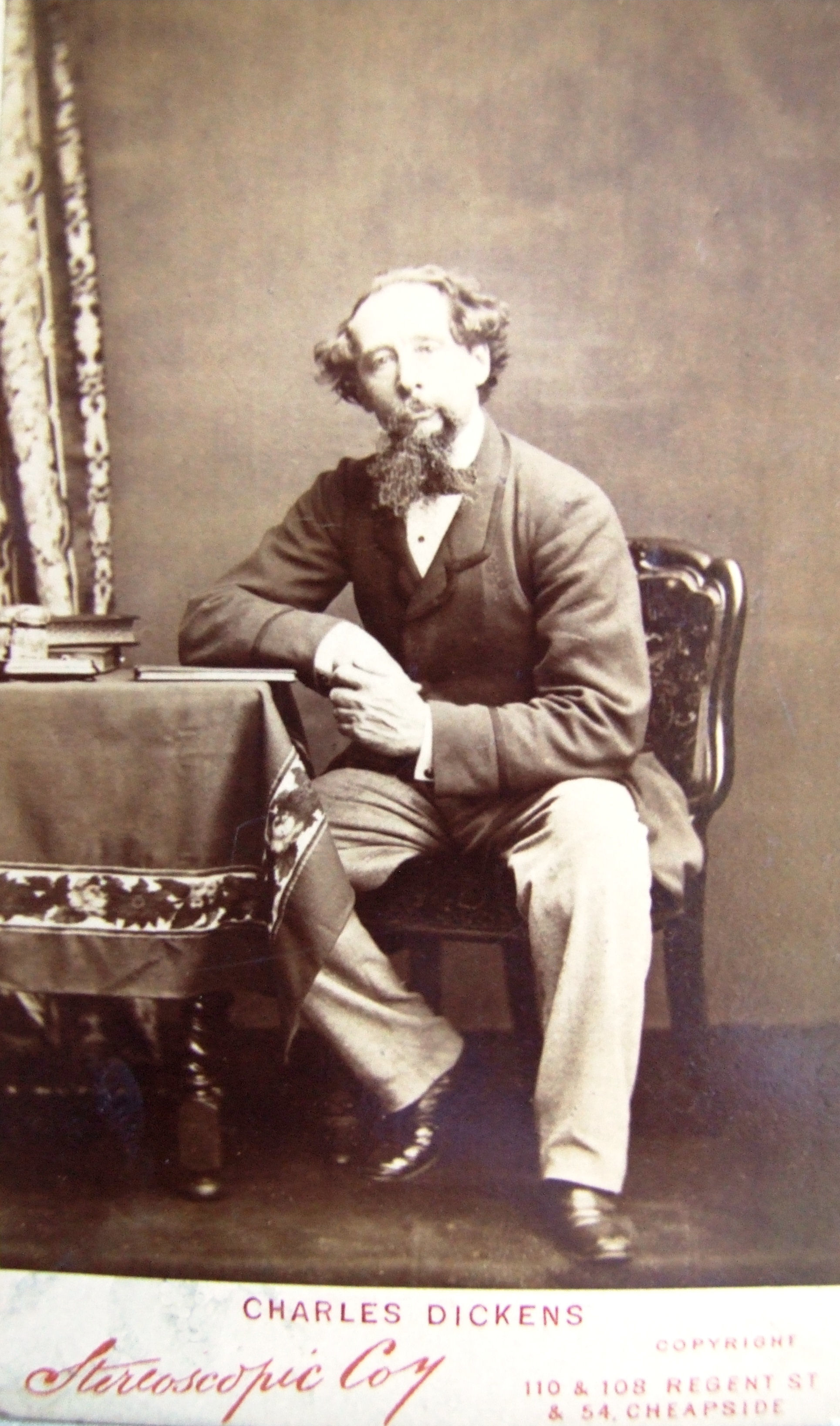 Ephemera; photograph of Charles Dickens; albumen print, 'carte de visite' card; picture taken in circa 1860's; published by the London Stereoscopic Co; studio shot of Dickens seated at a table; A7216-A7218 are the same sitting, different poses. Acquired and displayed at the museum in the early 20th century. These cards were very popular in the 1860's, & could be traded among friends & visitors, and collected & displayed in albums - the craze was known as 'Cardomania'.