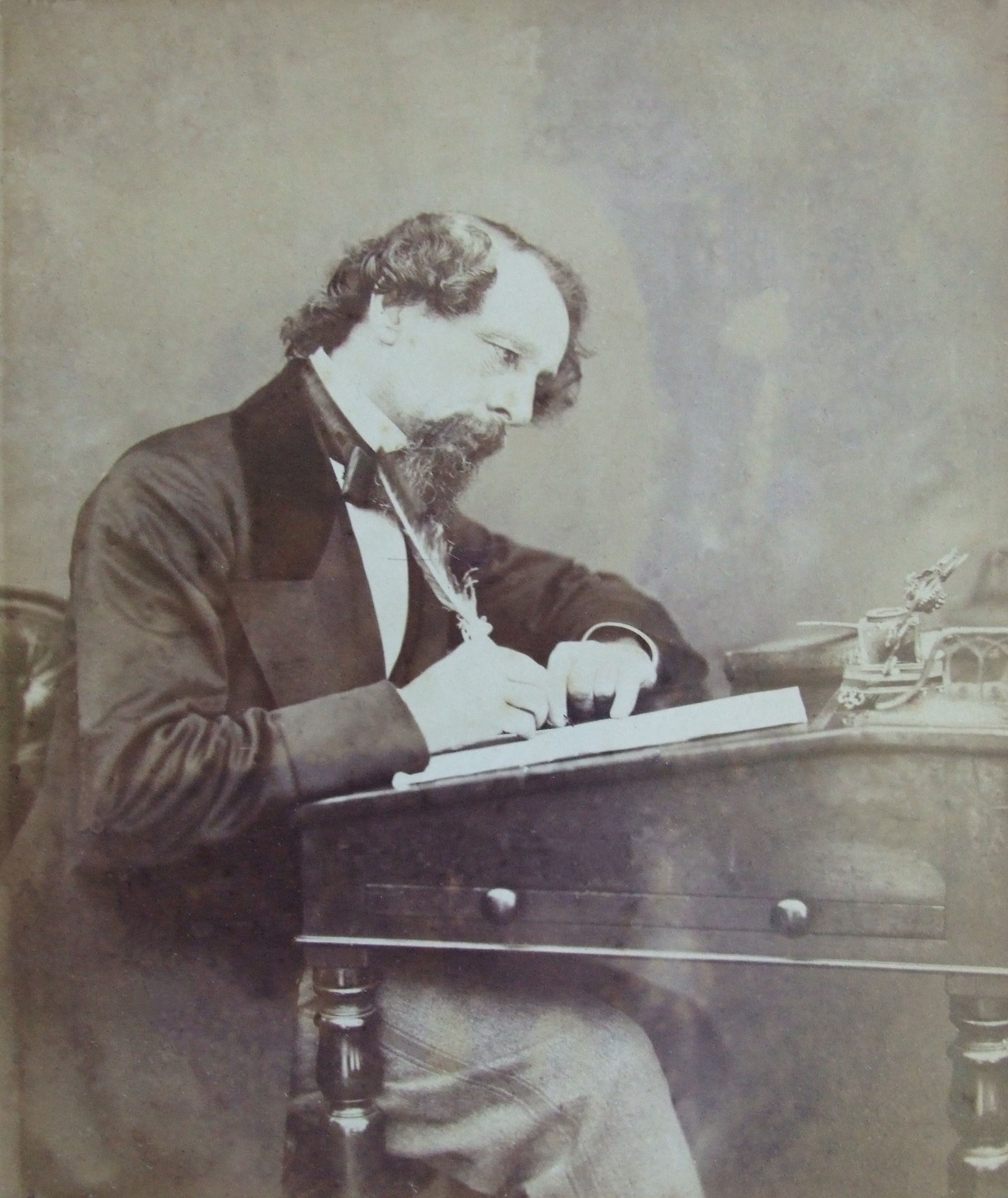 Ephemera; photograph of Charles Dickens (aged 46); sepia portrait print, on card; picture taken in c.1858 by George (Herbert) Watkins; shows Dickens seated at desk, writing; published c.1887-97. Acquired and displayed at the museum in the early 20th century. Fradelle & Young were active at 246 Regent Street between 1887-1897. Image has small scuffs & marks, residual glue around edge from old mount. A later version of this photograph has an added painted background with a draped curtain & bookcase.